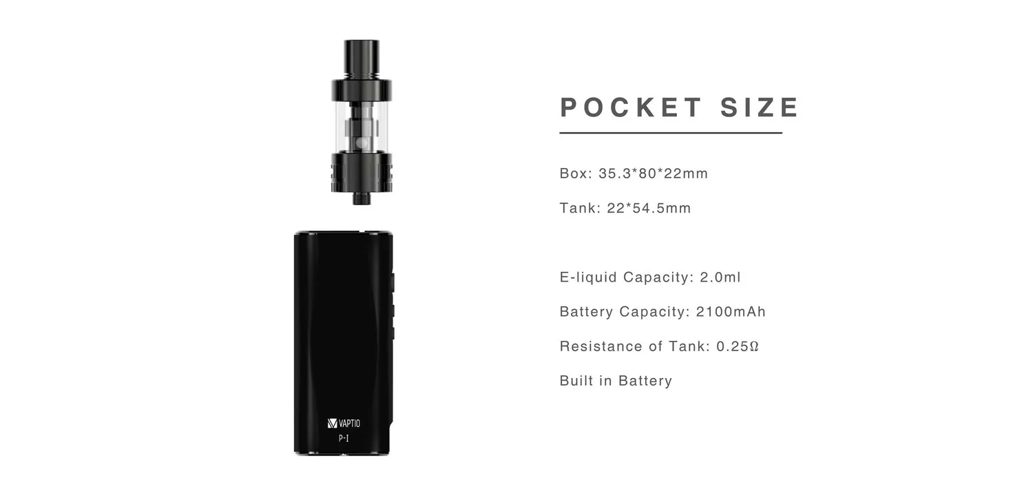 Набор Vaptio P-I поставляется с нижним резервуаром для наполнения и модной батареей 2100 мАч. С максимальной мощностью 50 Вт, он приносит удобный опыт вейпинга.