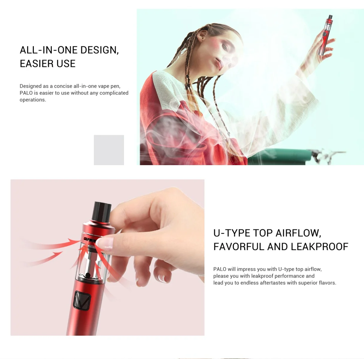 PALO комплект 1. Все в одном дизайне, проще в использовании 2. Верхний поток воздуха, благоприятный и герметичный 3. Способен на MTL и мелкий DL 4. Компактный и портативный 5. Удобное заполнение сверху Слитные 50 Вт комплект 1. Включен детский замок, предотвращающий случайное расчленение атомайзера из Мода 2. USB зарядка с ПК или настенным адаптером 3. Простой заправки 4. Легкое изменение головок катушки 5. Множественная защита: 10 м автоматическая защита блокировки, защита от короткого замыкания, защита от низкого напряжения, защита от перезарядки