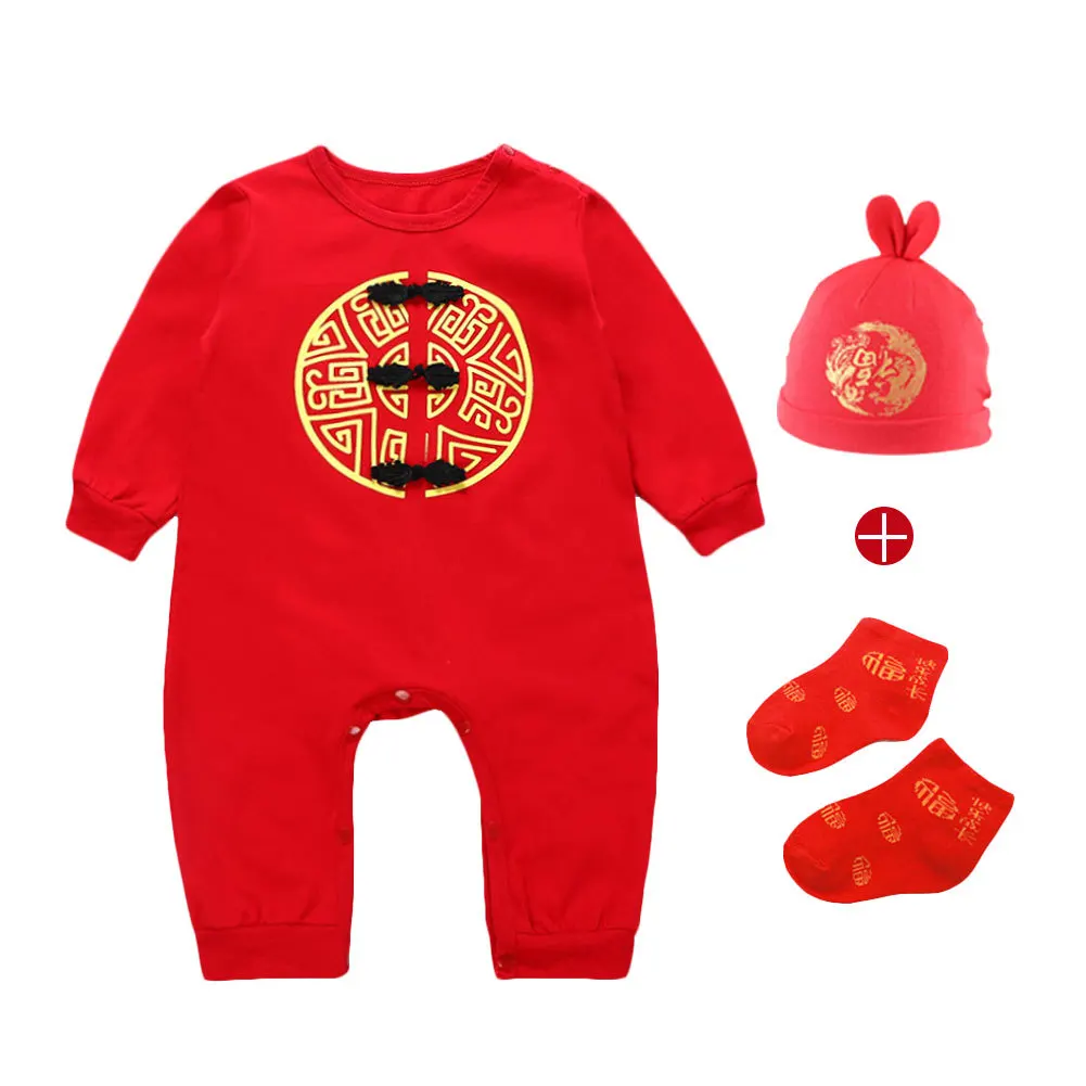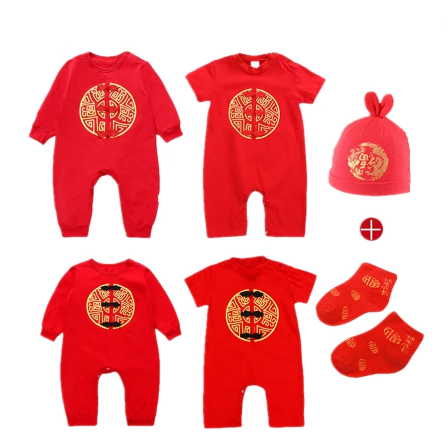 Комплект традиционной одежды унисекс для маленьких мальчиков и девочек, китайский новогодний костюм красный цельный комбинезон с вышивкой + шапка + носки, комплект для малышей
