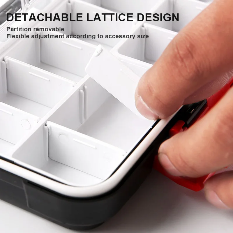 Коробка рыболовных снастей имеет два слоя, внешний слой ABS и внутренний слой ПК. Прозрачная внутренняя крышка ПК удобна для вас, чтобы узнать внутренние элементы хранения, не открывая его.