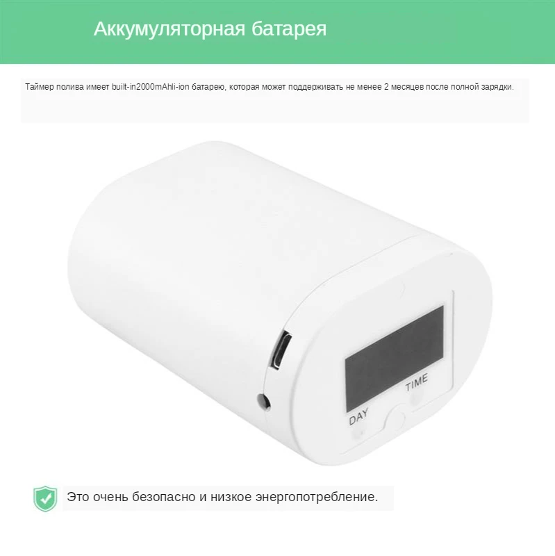 Таймер полива имеет встроенный литий-ионный аккумулятор 2000 мАч, который может поддерживать не менее 2 месяцев после полной зарядки. Это очень безопасно и низкое энергопотребление.
