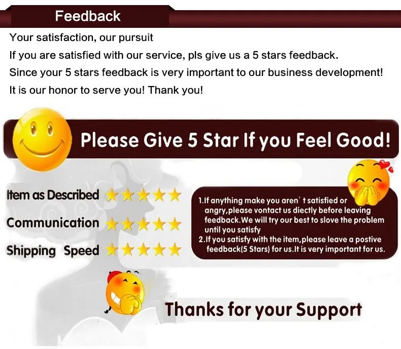 Если вы удовлетворены нашим продуктом и обслуживанием, пожалуйста, оставьте положительный Отзывы и поставьте нам 5 звезд.