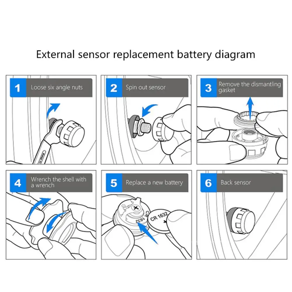 11. Когда шина нормальная, датчик будет обновлять данные каждые 5 минут. Когда давление и температура в шинах являются ненормальными, звуковой сигнал и экран брызг будут изданы в течение 3 секунд.