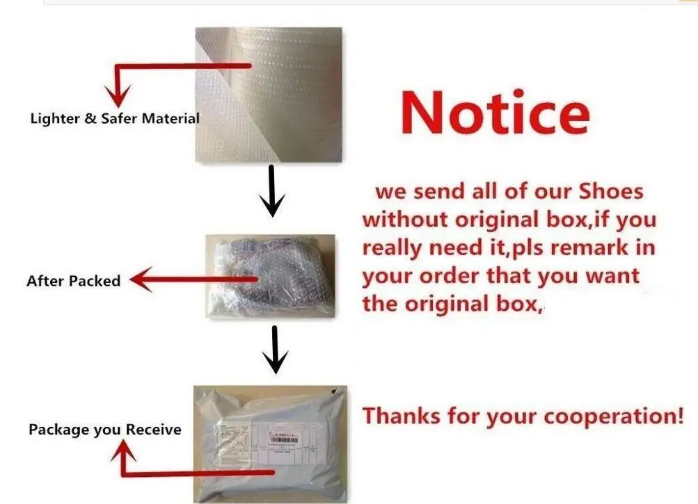 Обычно мы отправляем ботинки с логотипом, если вам не нужен логотип, пожалуйста, добавьте Примечание/Примечание при размещении заказа или отправьте мне сообщение после размещения заказа. Мы отправляем сапоги без коробки, потому что коробка тяжелая, вы должны заплатить Больше стоимости доставки, и это не легко освободить от таможни. Мы упаковываем в пузырчатую сумку. Это будет хорошее состояние после получения. Может быть, иногда немного морщится, но восстановится вскоре после того, как вы их вынете От
