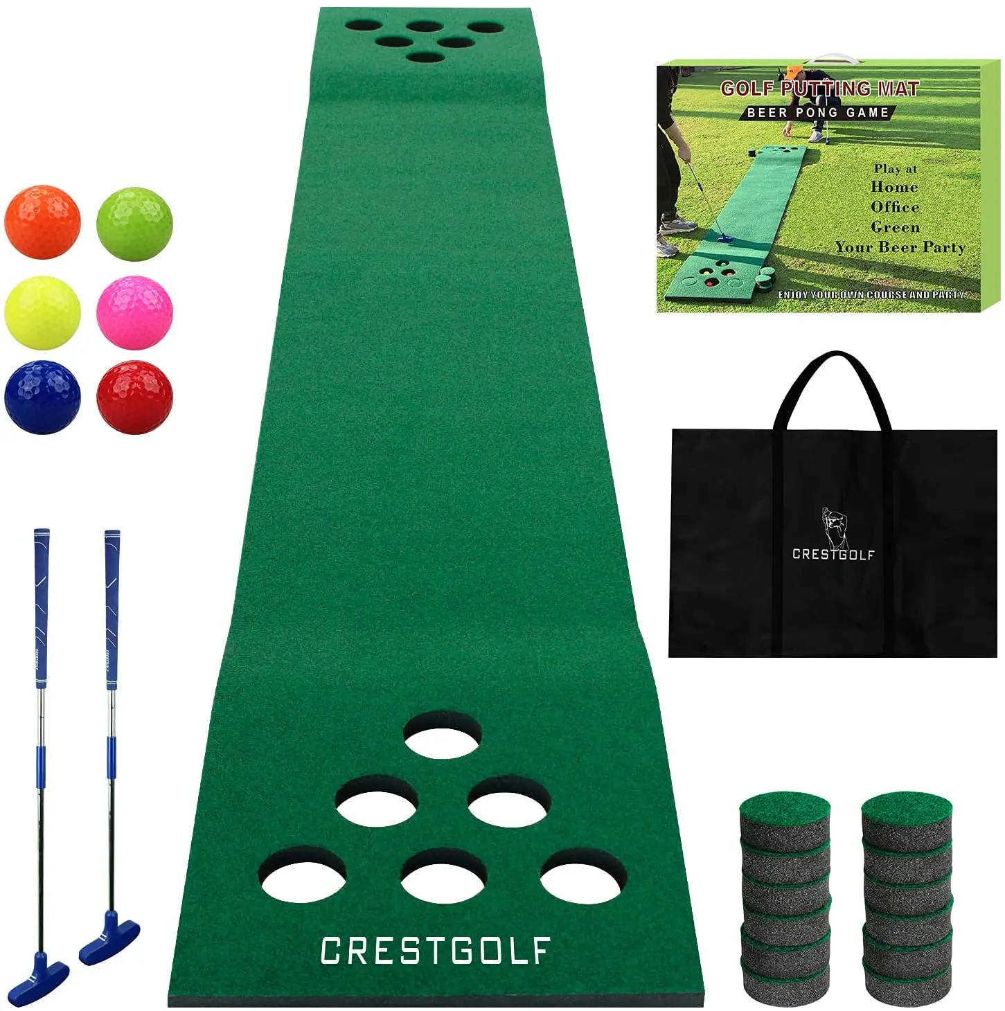 CRESTGOLF 327 см * 50 см Набор для игры в гольф, пиво, понг, зеленый коврик для домашнего использования, Противоскользящий коврик для гольфа с 2 желобами, 6 мячей для гольфа, 12 крышек с отверстиями для гольфа для использования в помещении/на открытом воздухе, Короткие вечерние игровые офисные Чехлы для двора
