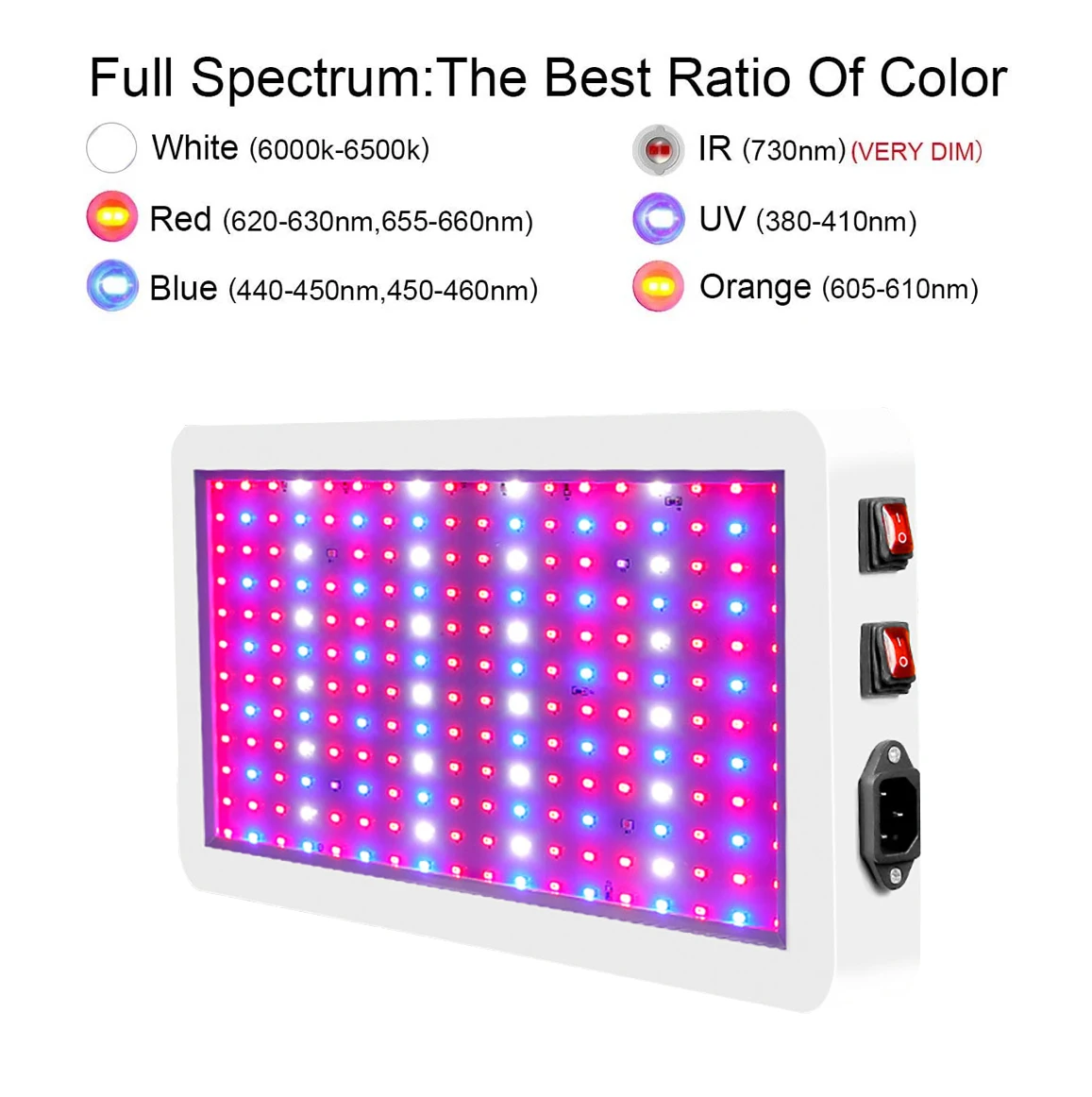 Переключатель Veg/Bloom Благодаря широкому тестированию роста растений переключатель Veg/Bloom был разработан, чтобы обеспечить правильный светильник для растений на различных этапах роста, чтобы значительно увеличить ваш урожай. Veg switch-синий светодиодный и белый светодиодный индикатор, используемый только для роста семян или рассады; Переключатель цветения-красный светодиодный и белый светодиодный. Для цветения можно использовать переключатели Veg и Bloom. Полный спектр 312 высокое качество супер яркий светодиодный свет, спектр 390nm-730nm, включая УФ ИК красный и синий. Растения могут получить наиболее желаемый спектр от этого светильник роста, подходящий для различных этапов роста, таких как семена, прорастание, растение и цветение. Широкий спектр применений Широко используется в качестве посадочных палаток, посадочных коробок, посадочных комнат, посадочных комнат, гидропоники, садов для разведения, теплиц, вертикальных ферм, садоводства в помещении и т. д. Подходит практически для всех растений, таких как травы, суккуленты, овощи, деревья бонсай, деревянные растения, орхидеи, лимоны, перцы, помидоры, Морские водоросли и т. Д. Энергосберегающая технология В отличие от традиционных HPS, наш светодиодный светильник для выращивания растений использует высокотехнологичный светодиодный чип (светодиодный двойной чип 10 Вт), наш светодиодный светильник мощностью 1000 Вт может заменить традиционный HPS мощностью 600 Вт, чтобы обеспечить более яркий светильник и сэкономить больше электроэнергии, что также может сэкономить много денег для вас. Удобный для пользователя Квадратный материал ABS, структура воздушного потока, отличная Охлаждающая способность, установка проста, весь растительный светильник можно собрать вручную без дополнительных инструментов.