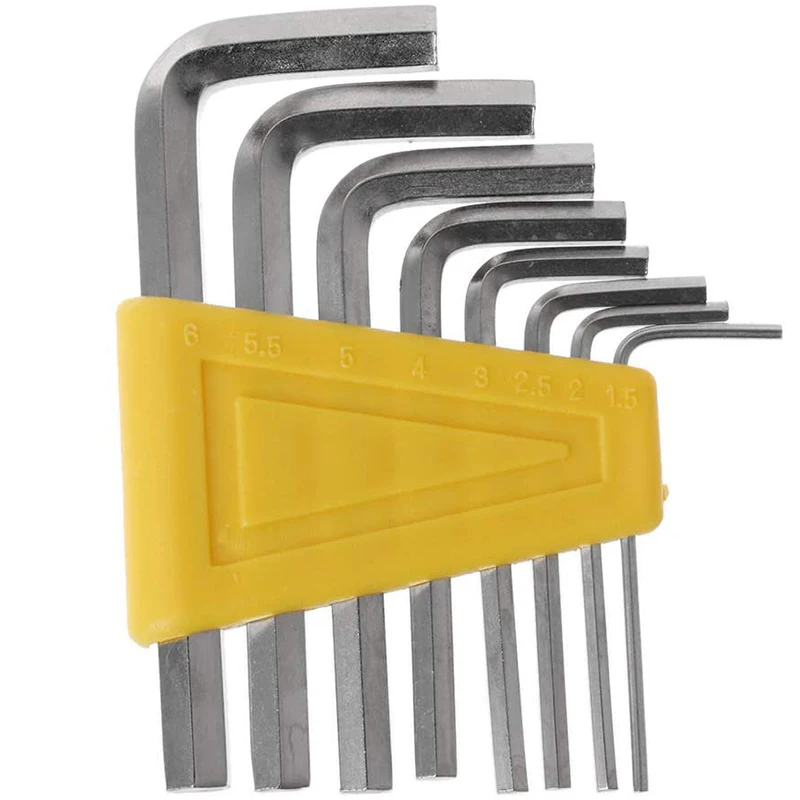 Формула преобразования: 1 дюйм = 25,4 мм Особенности: Высокая прочность, высокая прочность, износостойкость. Точно-размер, скошенные концы вставляются плавно в головку застежки, уменьшая износ. Откидной Чехол открывается на плоской подошве, что упрощает включение и выключение ключей. Длинные гаечные ключи обеспечивают дополнительный радиус действия и больший крутящий момент, что позволяет сохранить прочность и время, чтобы обеспечить плавную работу. Спецификация: Тип гаечного ключа: l-тип Материал: сталь 45 # Длина: мм Цвет: серебристый Характеристики: прочный, шестигранный ключ, высокая прочность, износостойкость, инструмент для ремонта велосипеда Количество: 5 шт метрических 8 метрических единиц 11 шт. в метрической 8 дюймов 11 дюймов 8 шт метрический желтый