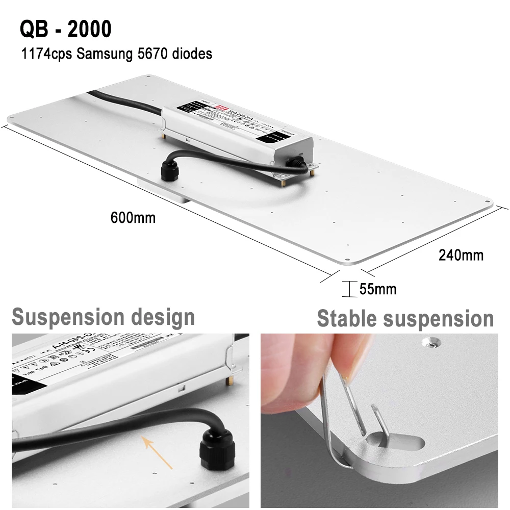 Model: QB1000 1000W actual power 100W----120W Input voltage: 85-264 (V) LED chip brand: LM301B Number of LED lamp beads: 234 Luminous flux: 8000 (lm) Light efficiency of lamps: 80 (lm/W) Power factor: PF95 Protection level: not waterproof Control method: plug in Size: 300*240*60 (mm) Certification: EU ce certification, hazardous substances (RoHS) Life: 50000 (H) Shell material: aluminum Temperature rise: 3500 (K) Weight: 2500 (g) Number QB2000 2000W actual power 215W----225W Input voltage 85-264 (V) LED chip brand LM301B Number of LED lamp beads 468 Luminous flux 8000 (lm) The luminous efficiency of the lamp 80 (lm/W) Power factor PF95 Protection level is not waterproof Control mode plugin Size 600 * 240 * 55 (mm) Life 50000 (H) Housing material aluminum Temperature rise 3500 (K) Weight 3820 (g) Model QB4000 Input voltage 85-264 (V) LED chip brand LM301B Number of LED lamp beads 936 Actual power 455W-----465W Luminous flux 8000 (lm) Luminous efficiency of lamps 80 (lm/W) Power factor PF95 Protection level not waterproof Control method plug in Size 600*480*55 (mm) Life 50000 (H) Shell material aluminum Temperature rise 3500 (K) Weight 7500 (g