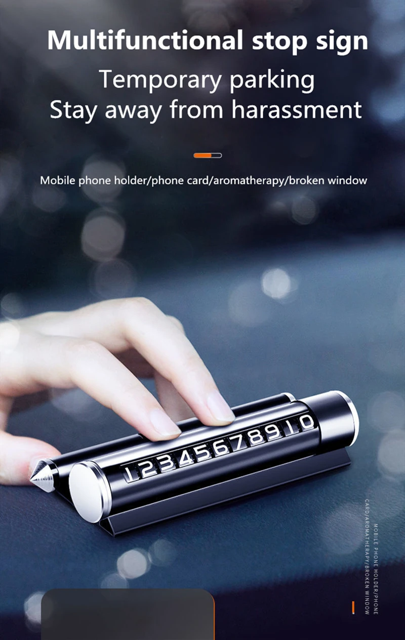 【Многофункциональное применение 】: Может использоваться в качестве выключателя окна, держатель на мобильный телефон, ароматерапия автомобиля, номер телефона. 【SAFE ESCAPE】: для обеспечения безопасности семьи и друзей, пожалуйста, используйте молоток безопасности, чтобы быстро избежать в чрезвычайной ситуации. 【Уникальный дизайн: стильный внешний вид, цифры могут быть объединены по желанию, и цифры могут быть скорректированы путем изменения циферблата, устраняя утомительную установку. Может скрывать антипритеснения и скрывать/показывать номер с помощью одной кнопки. 【PORTABILITY】: его можно снять с приборной панели и легко установить одной рукой без каких-либо инструментов. Мы можем поставить держатель телефона в наилучшее положение, чтобы убедиться, что наше поле зрения не отражает светильник и четко отображает экран. 【Подходит для любого автомобиля 】: Этот продукт подходит для частных автомобилей, поездов, автобусов, грузовиков, кораблей и других транспортных средств и является лучшим подарком для водителей. Спецификация: Название продукта: многофункциональная номерная табличка для парковки Функция: мобильный телефон + номерная табличка для парковки + ароматическая терапия + молоток безопасности Размеры: 5,5*2,2 дюймов Материал: алюминиевый сплав + Поликарбонат Цвет изделия: черный Вес нетто: 0,33 фунт Характеристика: Высококачественные материалы могут выдерживать высокие температуры, и солнце не деформируется и может быть покрыто; Временные знаки остановки, атмосферный внешний вид может украсить ваш автомобиль; Изменить несколько цифровых серийных номеров, Маленький и изысканный, не будет блокировать линию зрения.