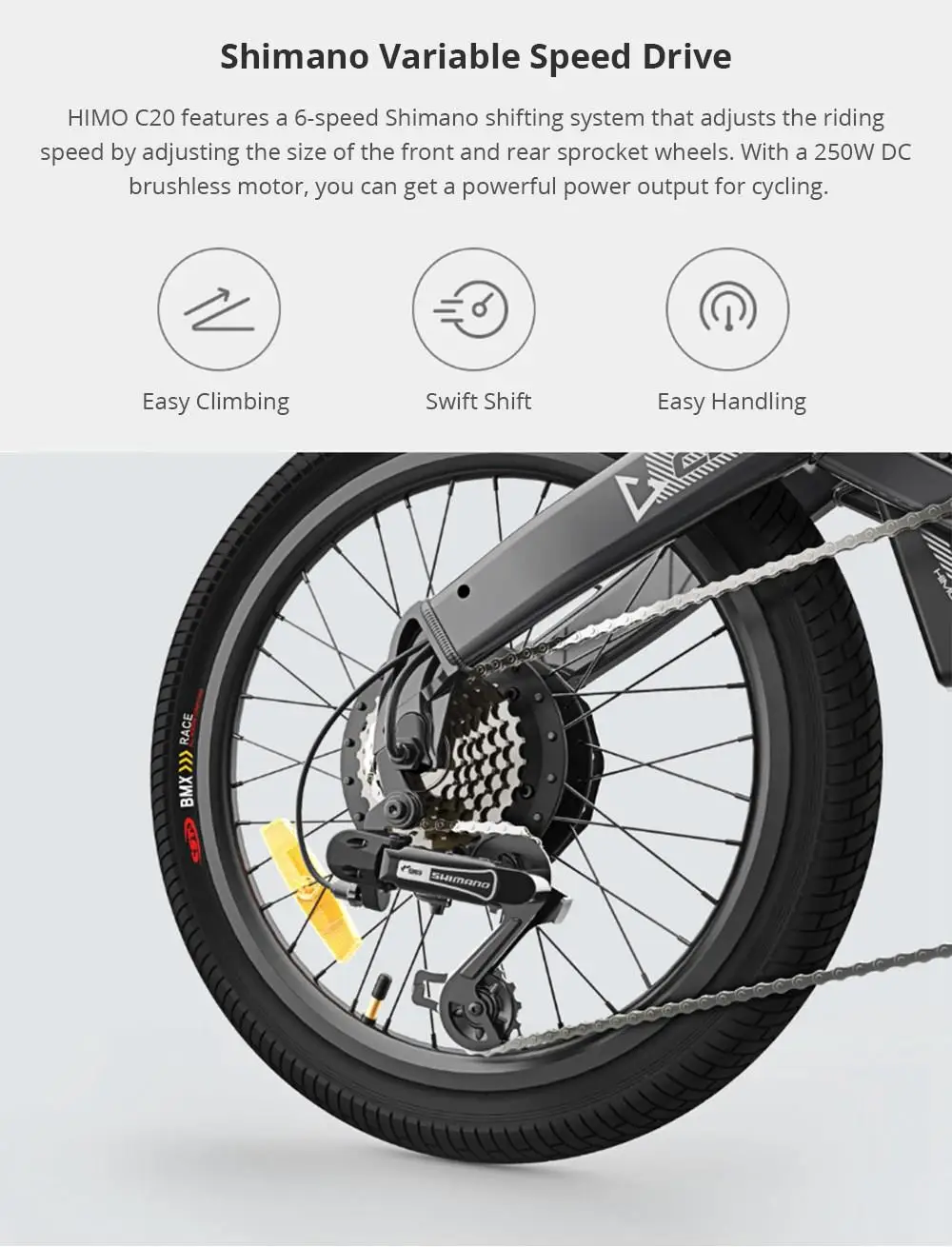 HIMO C20 имеет 6-ступенчатая Shimano система смещения, который регулирует скорость поездки, регулируя Размер передние и задние звездочки колеса. С бесщеточным Мотором постоянного тока 250 Вт вы можете получить мощную выходную мощность для езды на велосипеде.