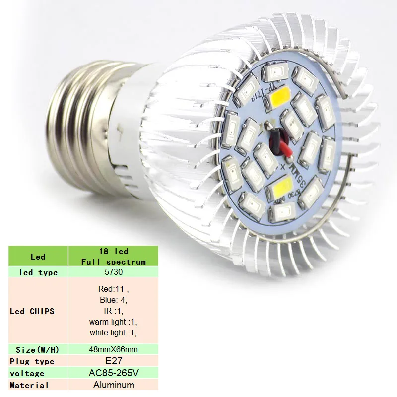 Напряжение: 85-265 В переменного токаЦоколь: E27LED Длина волны: Красный 660 нм, синий 445нмСветодиодный да: SMD5730Угол свечения: 180 градусовДиаметр: 48 ммДлина: 66 мм (E27)18 светодиодный ных ламп полного спектра:Напряжение: 85-265 В переменного токаЦоколь: E27Длина светодиодный Ной волны: Красный 660 нм, синий 445 нмСветодиодный да: SMD 5730Мощность: 8 ВтУгол свечения: 180 градусовДлина: 66 мм (E27)Диаметр: 48 ммКоличество СВЕТОДИОДНЫЙ Дов: 11 красных + 4 синих + 1 ИК + 1 теплсветильник + 1 светильник28 светодиодный ных светильников полного спектра:Количество СВЕТОДИОДНЫЙ Дов: 16 красных, 8 синих, 2 теплых белых, 2 холодных белыхНапряжение: 85-265 В переменного токаЦоколь: E27Длина светодиодный Ной волны: Красный 660 нм, синий 445 нмСветодиодный да: SMD5730Мощность: 10 ВтУгол свечения: 180 градусовДиаметр: 48 ммДлина: 66 мм (E27)Особенности зажима:• 1/2/3 головки x цоколь цоколя E27 адаптер зажимы-преобразователи на выбор• Переключатель: 1 Переключатель ВКЛ/ВЫКЛ• Вилку США/ЕС можно напрямую подключить или заменить лампочками• С контролем переключатель вкл./выкл.• Регулируемый на 360 градусов держатель лампы, вы можете изменить угол освещения и высоту лампы по своему усмотрению.Светильник вес, простота установки• Подходит светодиодный Ной/CFL лампы, которая должна быть не более 70 Вт•Тип штекера: США/ЕС• Номинальный ток: 6А• Мощность: 100-240 В• Цвет: белый• Материал: высококачественный металл и пластик, изготовлен из прочного и практичного металла и пластика• Длина кабеля: прибл. 30 см на каждую шею.• Длина кабеля питания около 160 см