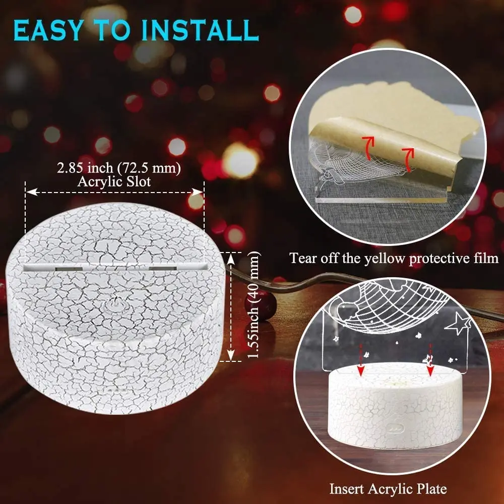Основные характеристики: 1. 16 цветов изменяют заказ: красный, зеленый, синий, желтый, голубой, фиолетовый, белый и многое другое. 2. Режим касания: пожалуйста, нажмите сенсорную кнопку, чтобы изменить один цвет. 3. Режим дистанционного управления: новая функция дистанционного управления с включением/выключением, сбросом, перемещением вперед/перемещением предварительно Оставайтесь на одной цветной кнопке, изменение цвета с помощью многих режимов, таких как диммер, 4 скорости вспышки, регулярные/нерегулярные и быстрые/медленные 1 цвет s меняется автоматически. Дистанционное управление с дополнительным временем сна и контролем яркости 4. Питание осуществляется через usb-кабель или аккумуляторы, вы можете использовать usb-кабель, соединяющий его с usb-разъемом питания или usb-портом компьютера, если вы хотите подключить его к розетке, рекомендуется использовать адаптер для телефона. Вы также можете поставить 3 батарейки AA к питанию (батарея не входит в комплект). 5. Эффект 3D видения, особенно в темноте или сделайте фотографию, зрение будет сильным! 6.PMMA акрил не является стеклом, вся доска является твердым акриловым материалом. Сильный, жесткий, высокая прочность, не хрупкий, не повредит ребенку; Технология лазерной гравировки, никогда не выцветает. 7. Очень низкая теплопроводность, не будет жарко после долгого рабочего времени, мягкий теплый светильник, не повредит глаза. 8. Широко используется в различных декорациях окружающей среды, улучшает экологический художественный вкус, демонстрирует теплый свежий, Модный 3D визуальный эффект. Посылка включает: 1 акриловая панель 1 черная основа ABS 1X дистанционный пульт (16 цветов модель дистанционного управления поставляется с Дистанционный пульт, а, в наличии 7 цветов, сенсорный экран модель не имеет дистанционный пульт.) 1X кабель Micro USB 1X Руководство пользователя Основной метод: Протрите акриловую салфетку в чистой комнате Не прикасайтесь к поверхности акриловой пластины пальцами, чтобы избежать отпечатков пальцев на пластине, которые могут повлиять на иллюзию 3D Обратите внимание: 1. Акриловая доска с защитной пленкой, пожалуйста, снимите защитную пленку перед использованием, светильник будет более прозрачным. И товары не включают батареи. 2. Батарея в комплект не входит