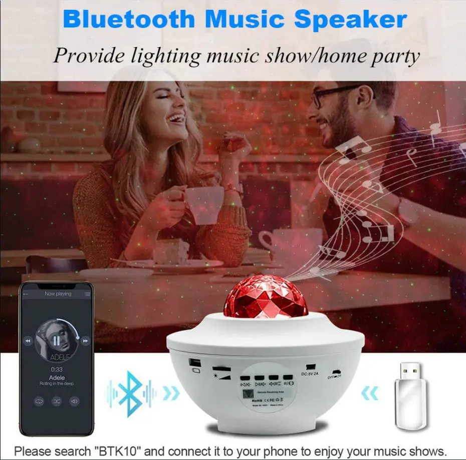 Звездный проектор имеет функцию мерцания, активируемую звуком. Пока есть музыка или хлопает в руки светильник будет мигать в соответствии с музыкальным ритмом, который создает проекцию звездного неба. Bluetooth колонки.