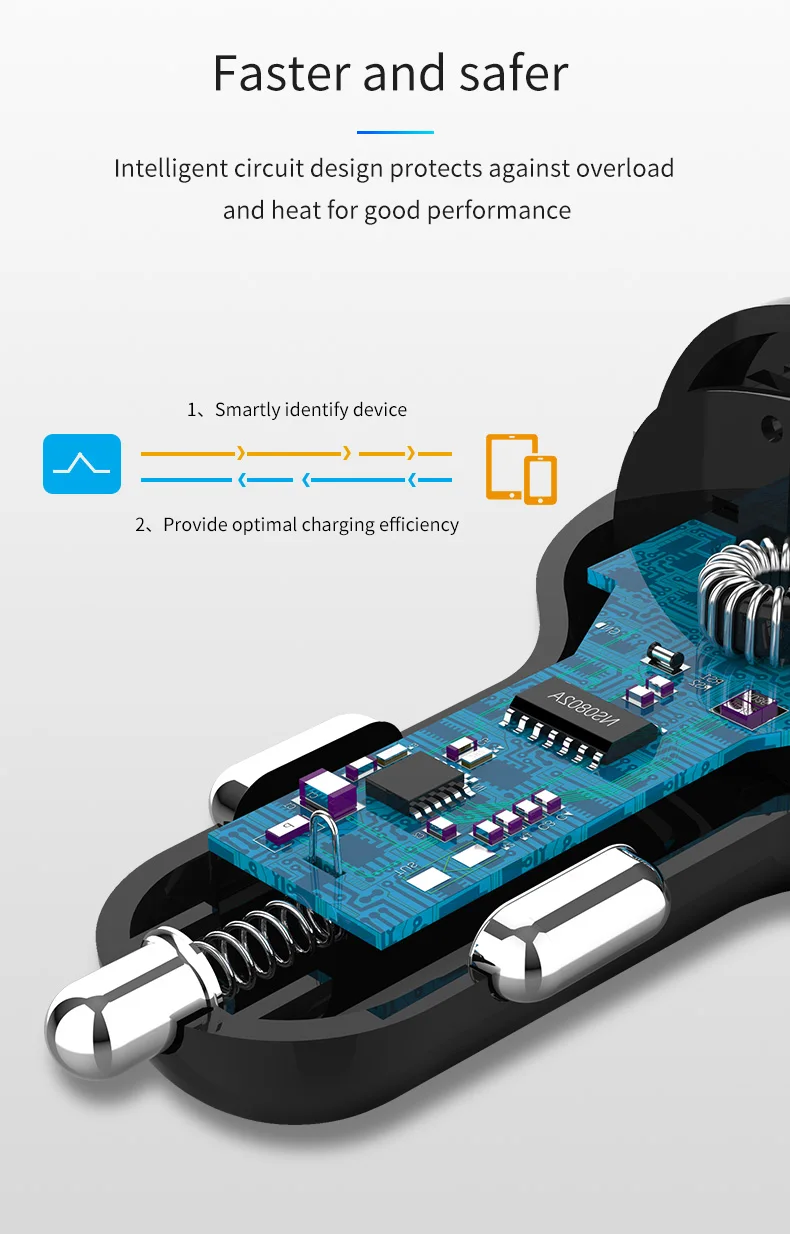 ●Устройство входит в usb-порт автомобильного зарядного устройства, а другой конец-в устройство.