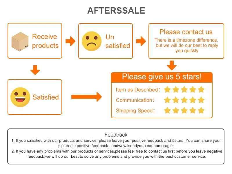 1. В: когда будет отправлен заказ? О: я отправлю заказы в течение 24 часов (около 48 часов в выходные дни) после подтверждения оплаты. 2. В: я не получил свой заказ в течение очень длительного времени, что я должен сделать? A: Пожалуйста, попробуйте позвонить или перейти, чтобы спросить ваше местное почтовое отделение, где оно там с вашим номером отслеживания, иногда им нужно, чтобы вы выбрали. 3. В: я получил пакет, но это не то, что я заказал внутри, что я должен сделать. A: пожалуйста, храните пакет и свяжитесь со мной сначала, я отвечу вам в течение 24 часов (около 48 часов в выходные дни). 4. В: я получил свой заказ, но он поврежден, что я должен сделать? A: если наружная упаковка, безусловно, повреждена, пожалуйста, сделайте фото немедленно и откажитесь войти, а затем свяжитесь со мной вовремя.
