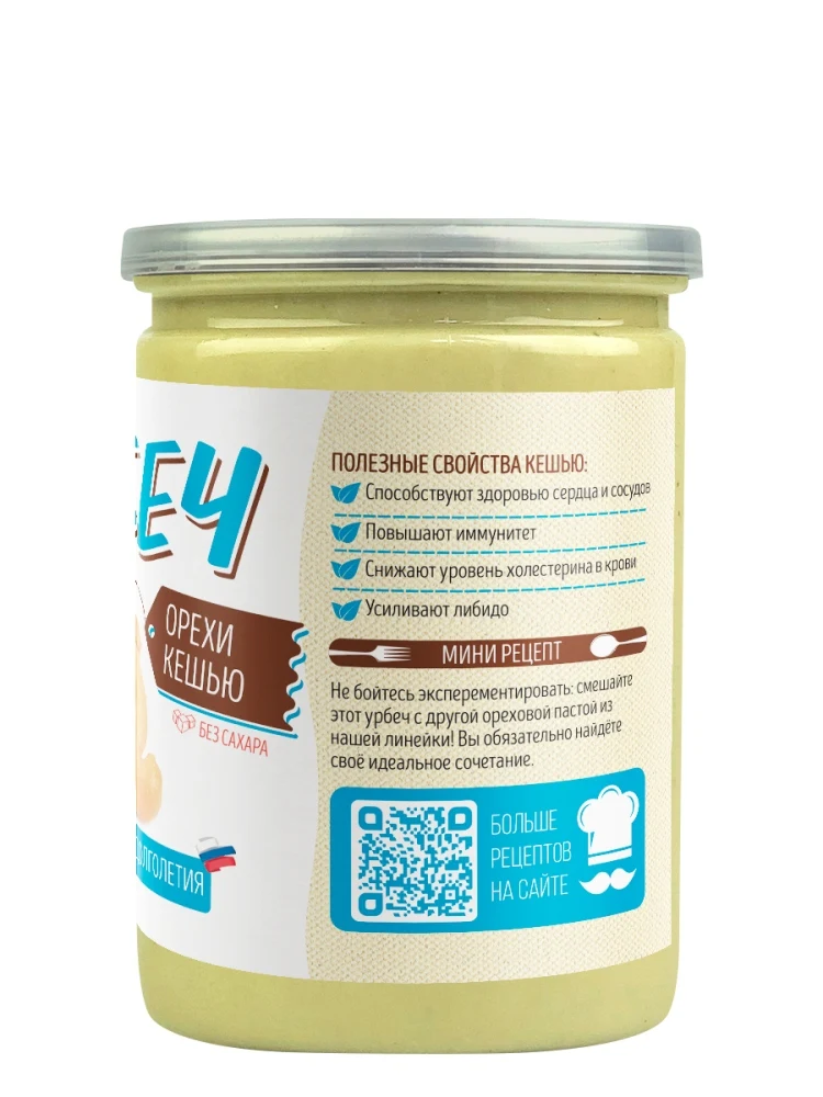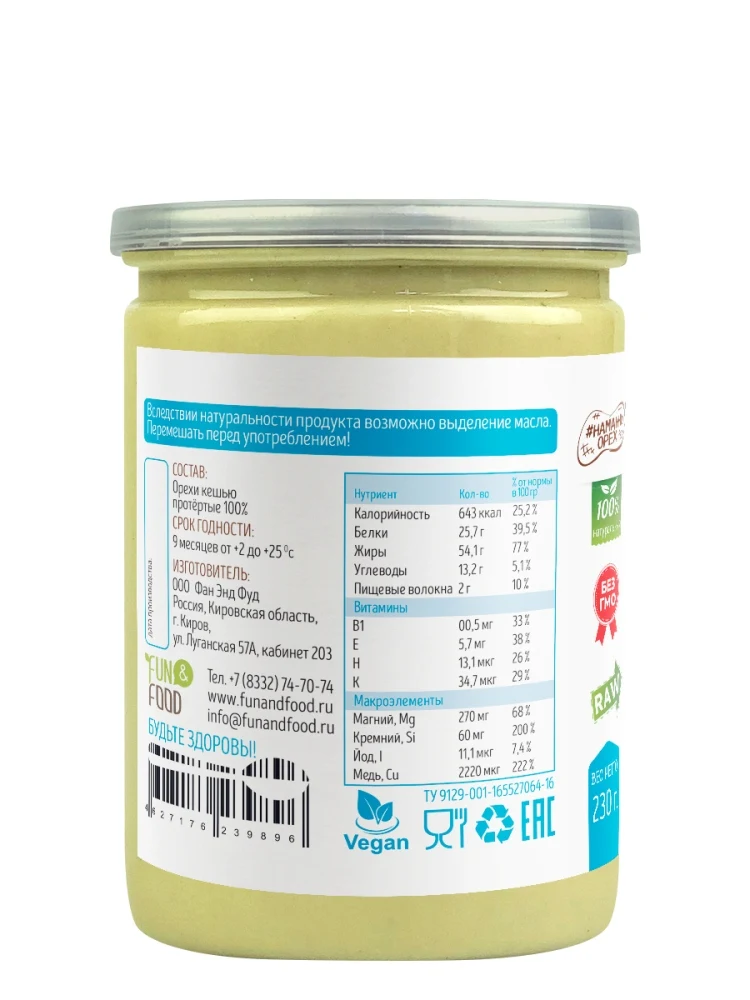 Состав: кешью перетертый 100%. Тающий нежный вкус нашего урбеча из кешью надолго выкинет Вас из реальности. В пасте много витамина Е, который является отличным антиоксидантом и витамином молодости, а также вещества, препятствующие разрушению зубной эмали. Добавляйте ее в каши, выпечку, в десерты с яблоками, грушами, бананами. Намажьте на тост или хлебец - сделайте ваш завтрак вкуснее! Внимание! Вследствие натуральности продукта возможно выделение масла. Перемешать перед употреблением Энергетическая ценность на 100 гр: Ккал 643 Пищевая ценность: Белки 25,7 г. Жиры 54,1 г. Углеводы 13,2 г. Фасовка - пластиковая баночка, вес 230 грамм. Срок годности 9 месяцев Доставка по всей России.
