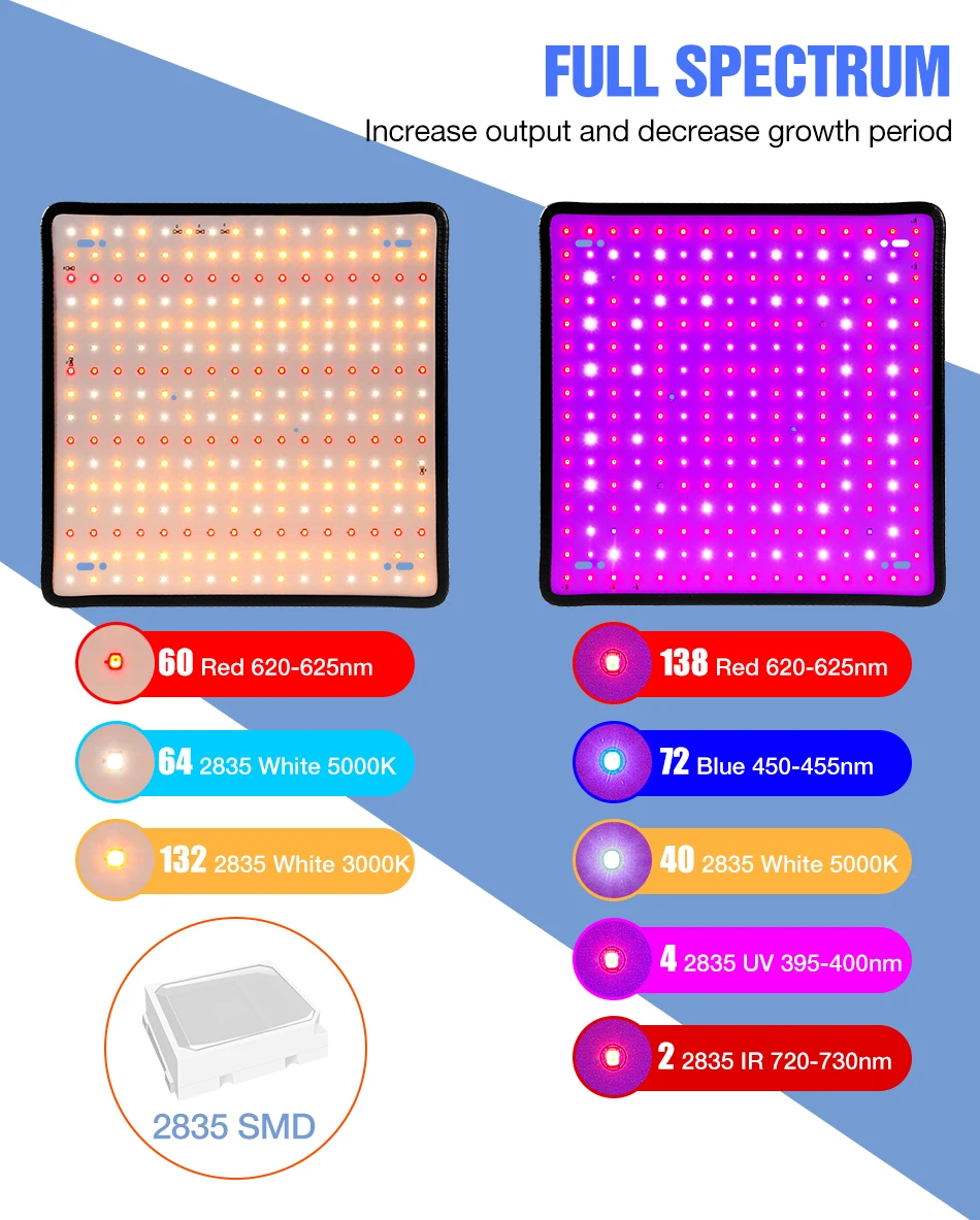 Тип полного спектра A: красный (138 светодиодов) + синий (72 светодиода) + белый (40 светодиодов) + УФ (4 светодиода) + инфракрасный светильник (2 светодиода)