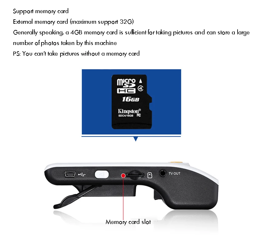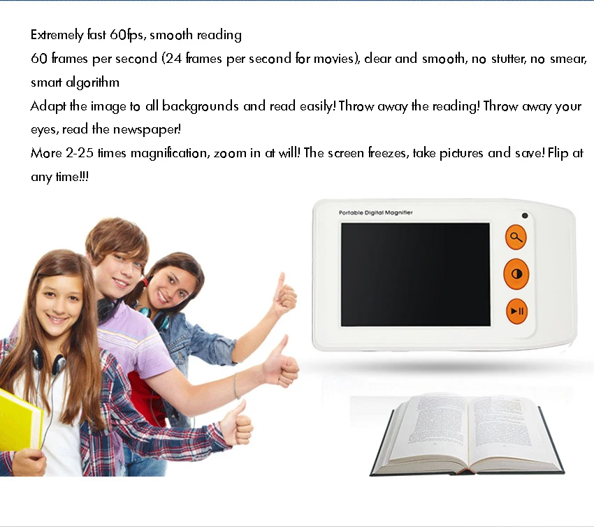 Package includes: 1 set of digital video magnifier The product will be upgraded constantly, the appearance and color may be changed, please don't mind. And take a consideration before place the order if you have request for color or appearance. Product specifications 1. Display type: 3.5-inch TFT LCD display (true color)2. Display resolution: QVGA (320x240)Pixel: 300,000 hardware3. Brightness: 250cd/M4. Can be connected to a large TV screen5. Foldable bracket6. Magnification: 2 times to 25 times magnification (2, 4, 8, 16, 25 times)7. Product size: 128mm x 78mm x 34mm8. Display mode selection: 8 color modes.9. Support memory card, maximum support 32G10. Support for taking pictures, support for connecting to a computer to view photos. Support screen freeze11. Battery powered, continuous working time: more than 3 hours, built-in lithium battery data cable charging12. Product weight: 140.2g