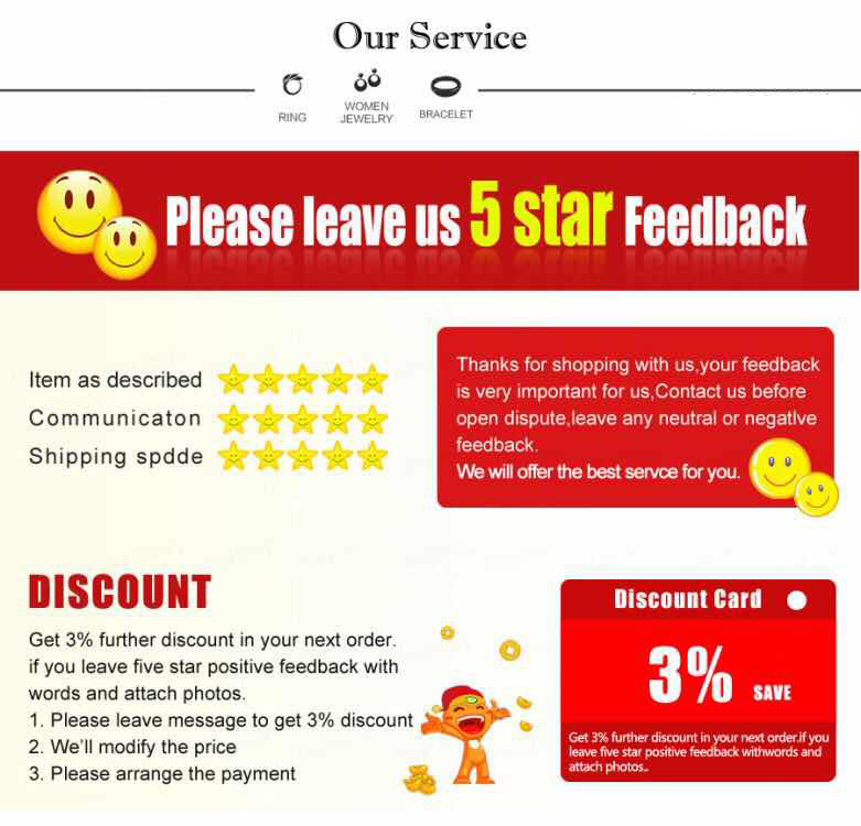 3. Если вы удовлетворены товарами, довольны сделкой, пожалуйста, оставьте нам положительотзывы в, это очень важно для нас, большое спасибо!