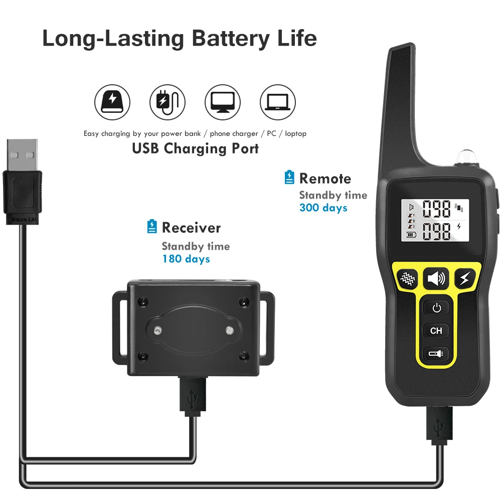 Этот тренировочный ошейник PD529 имеет 3 режима работы, вибрацию и шок звукового сигнала, с дистанционным диапазоном 1000 м, водонепроницаемый приемник IPX7, перезаряжаемый легкий тренировочный ошейник для собак