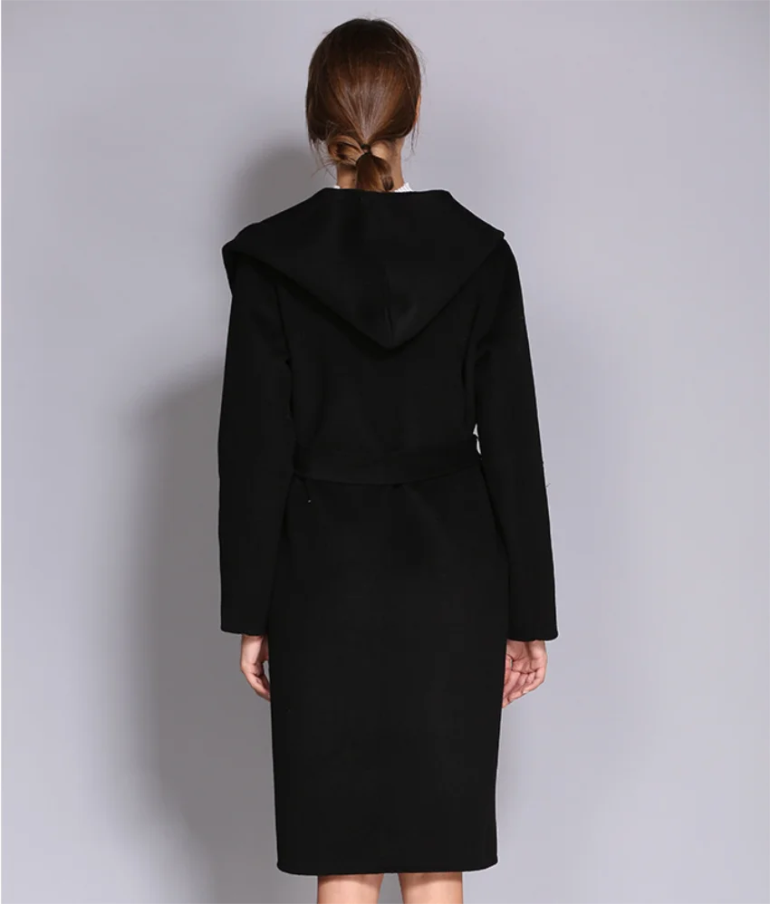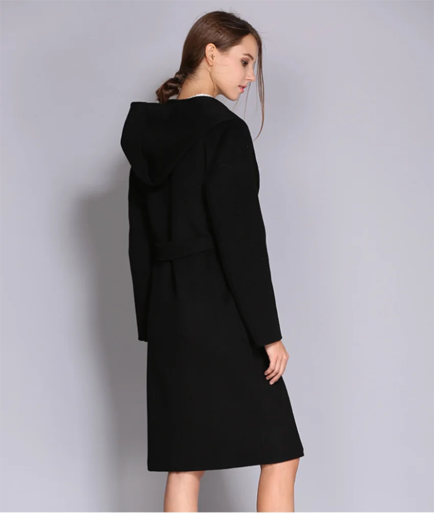 Классическое черное пальто длинное зимнее женское Шерстяное Пальто и куртки с капюшоном FLA028