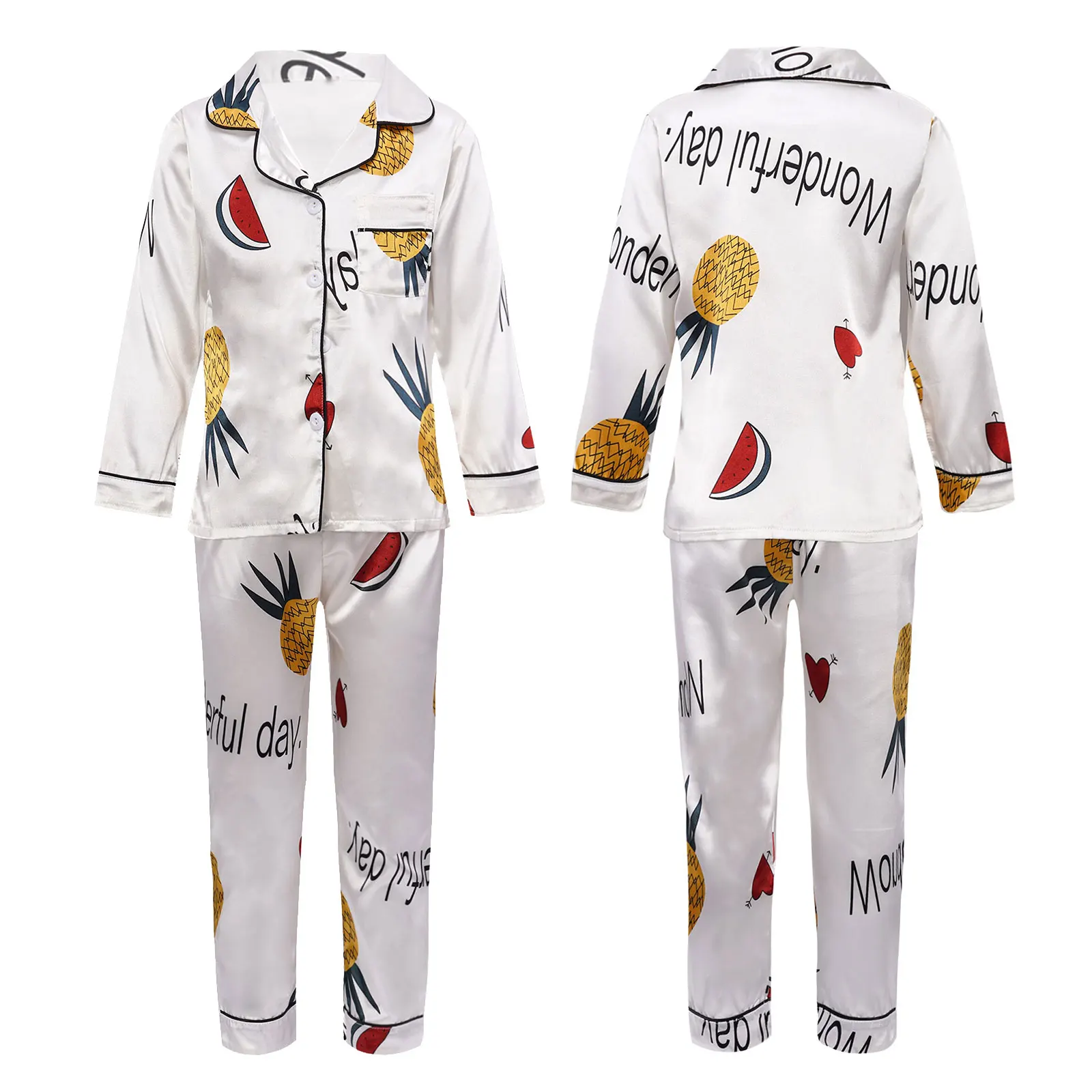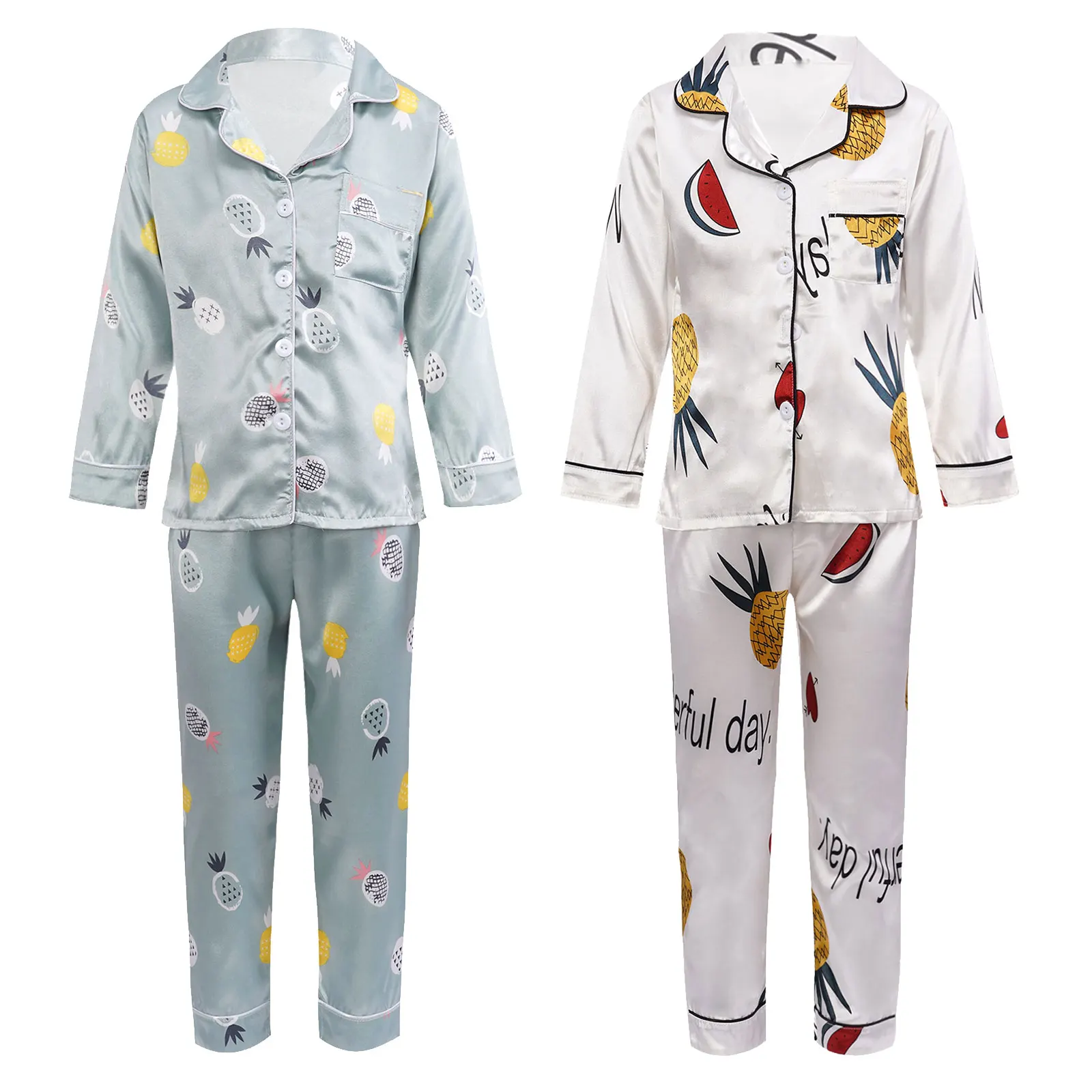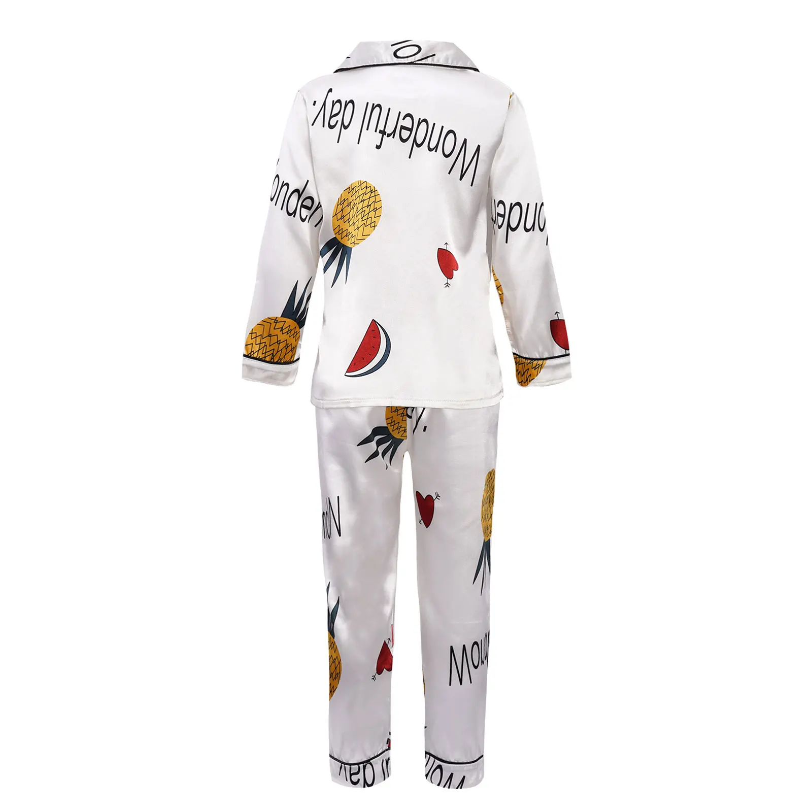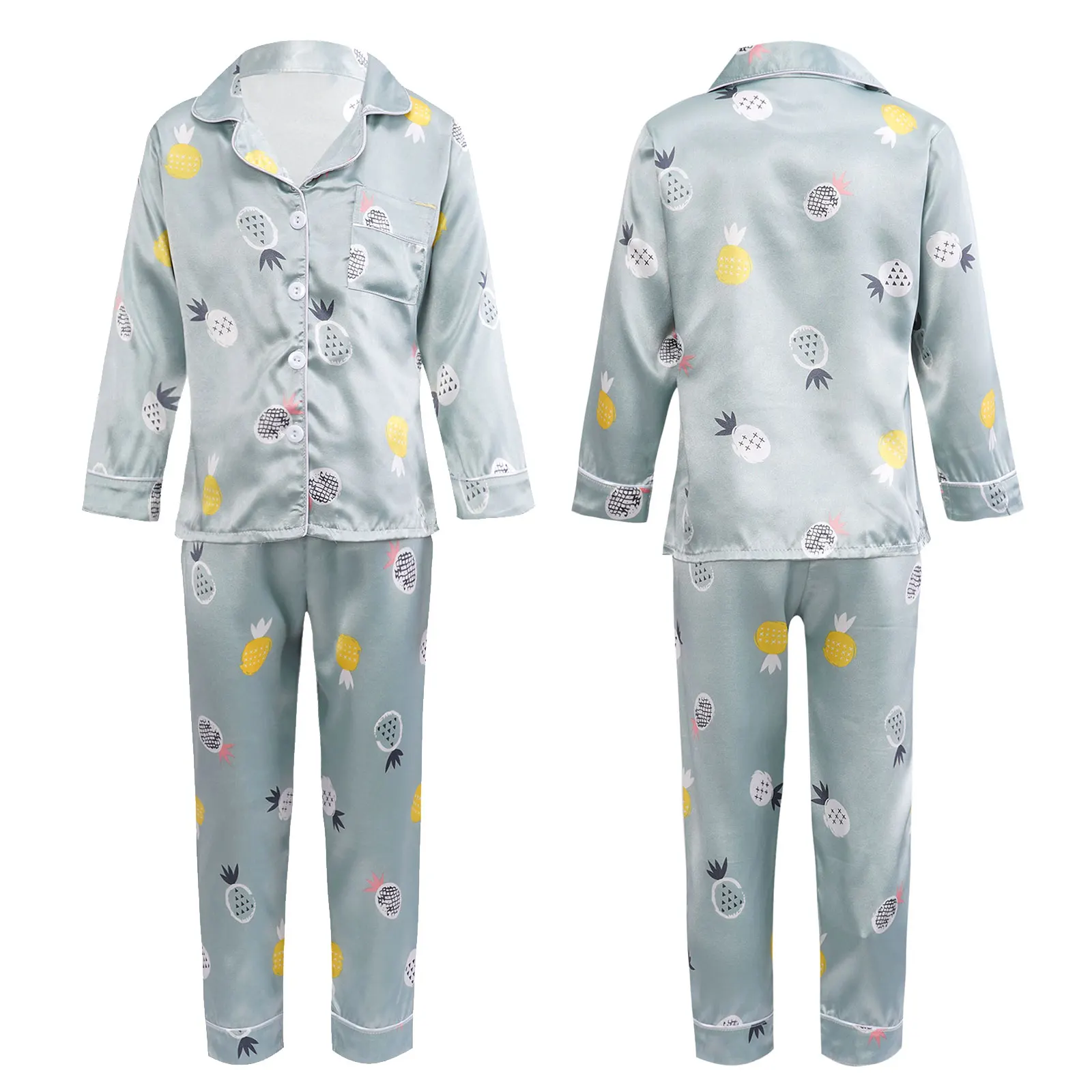 Детская осенняя шелковистая пижама из искусственного атласа с принтом ананаса для девочек, 2 предмета, ночная рубашка, Пижамный костюм с отложным воротником, длинными рукавами, карманами и пуговицами, комплект со штанами с эластичным поясом, #8-18