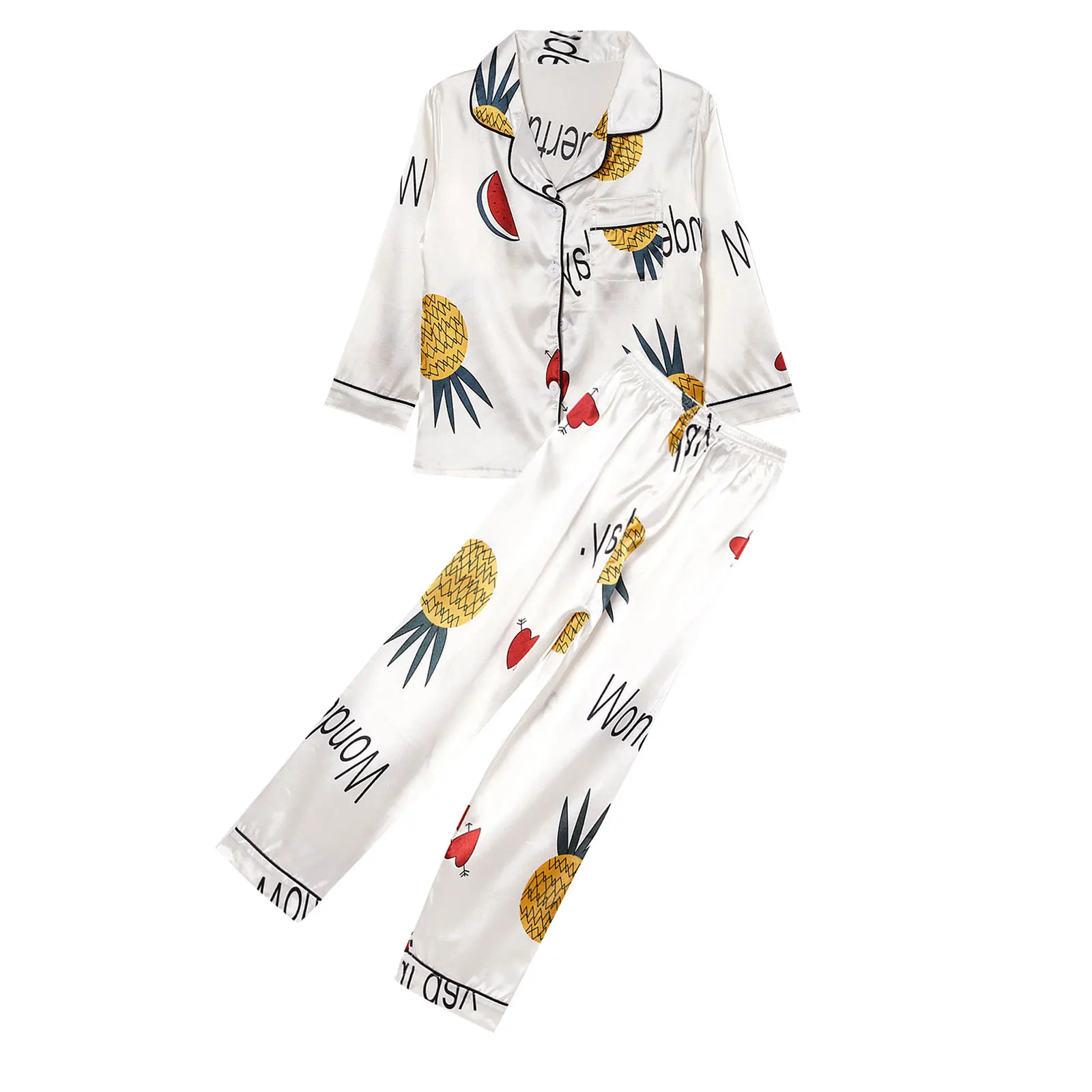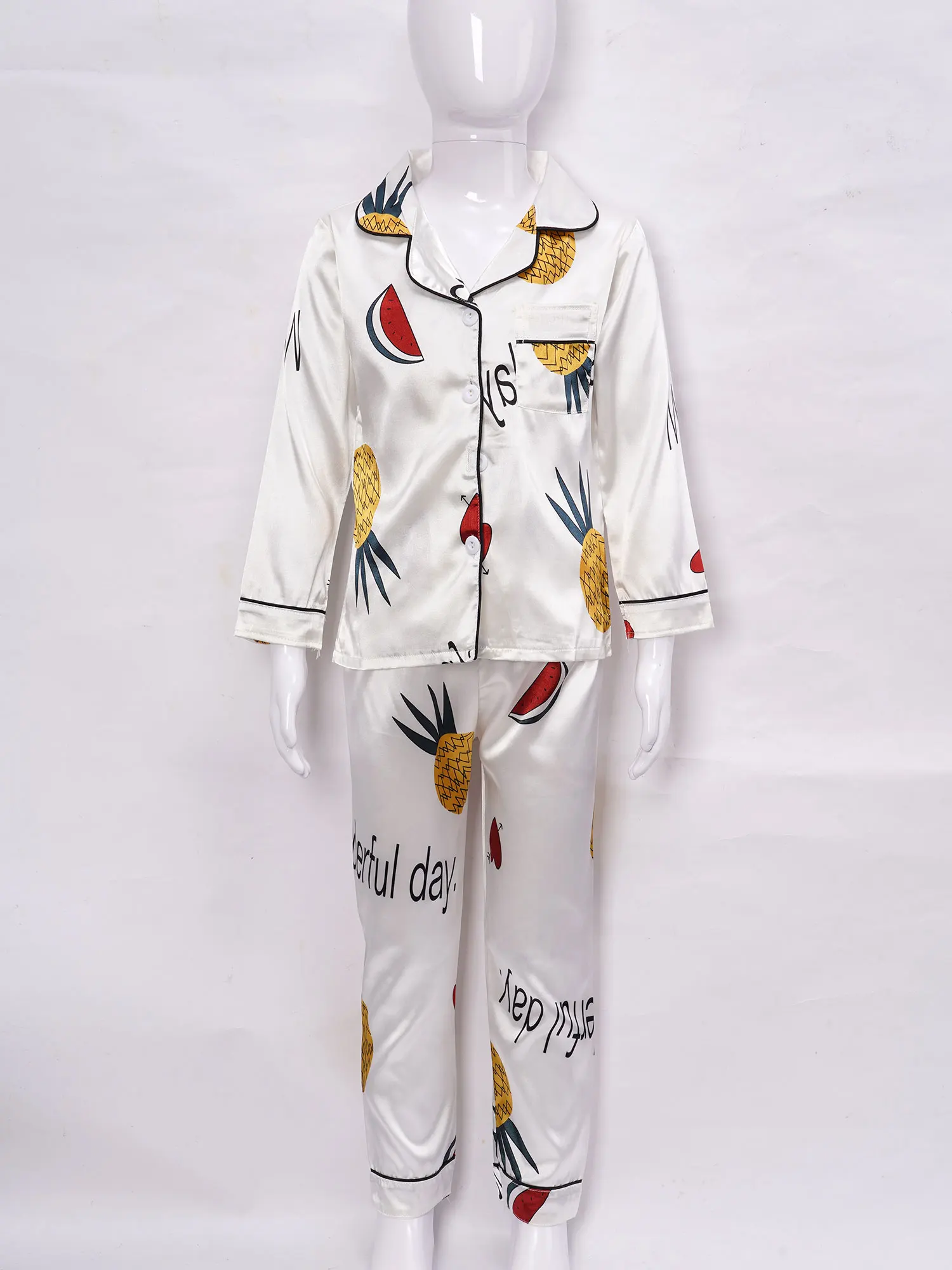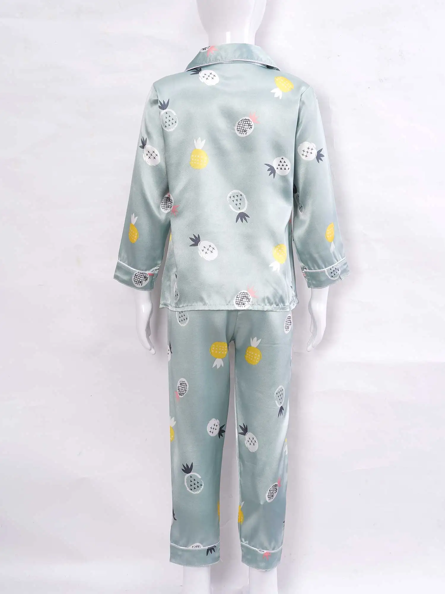 Детская осенняя шелковистая пижама из искусственного атласа с принтом ананаса для девочек, 2 предмета, ночная рубашка, Пижамный костюм с отложным воротником, длинными рукавами, карманами и пуговицами, комплект со штанами с эластичным поясом, #8-18