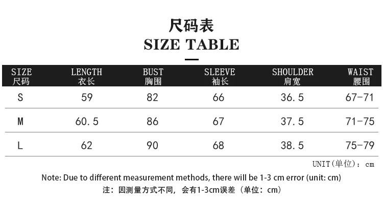 Таблица размеров (этот размер соответствует размерам одежды)S Длина 59,0 см обхват груди 82 см рукав 66 см Плечо 36,5 см талия 67-71 смМ Длина 60,5 см Обхват груди: 86 см, длина рукава 67 см, обхват плеч 37,5 см обхват талии: 71-75 смL Длина 62,0 см обхват груди 90 см Рукав 68 см плечо 38,5 см талия 75-79 см