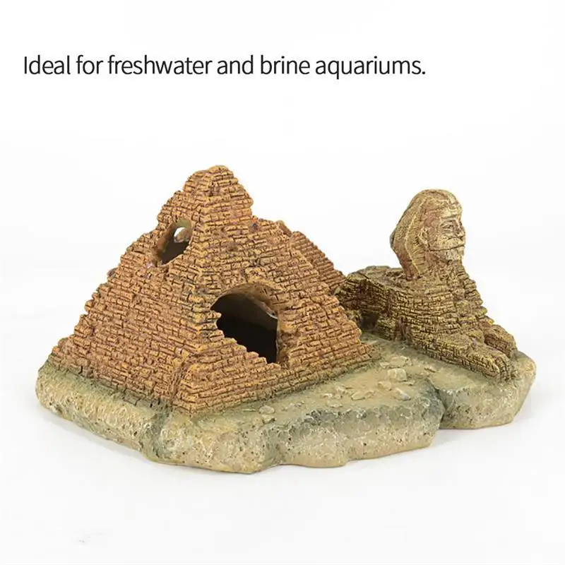 Пирамида сфинкс, уникальная форма, с древним и таинственным чувством. Он может притягивать рыбу, а небольшие отверстия внутри предназначены для укрытия рыбы, и в то же время делают ваш аквариум более стильным. Плоское дно, легко и стабильно помещается в аквариум.