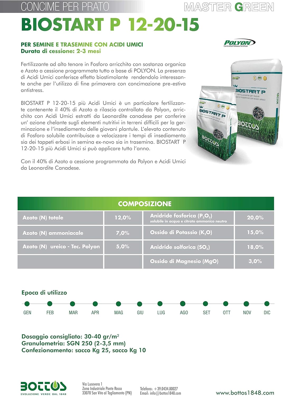 The specific BIOSTART 12-20-15 is a fertilizer for turfs high-P enriched it with organic substance and with the 40% N-divestiture programmed POLYON 2-3 months