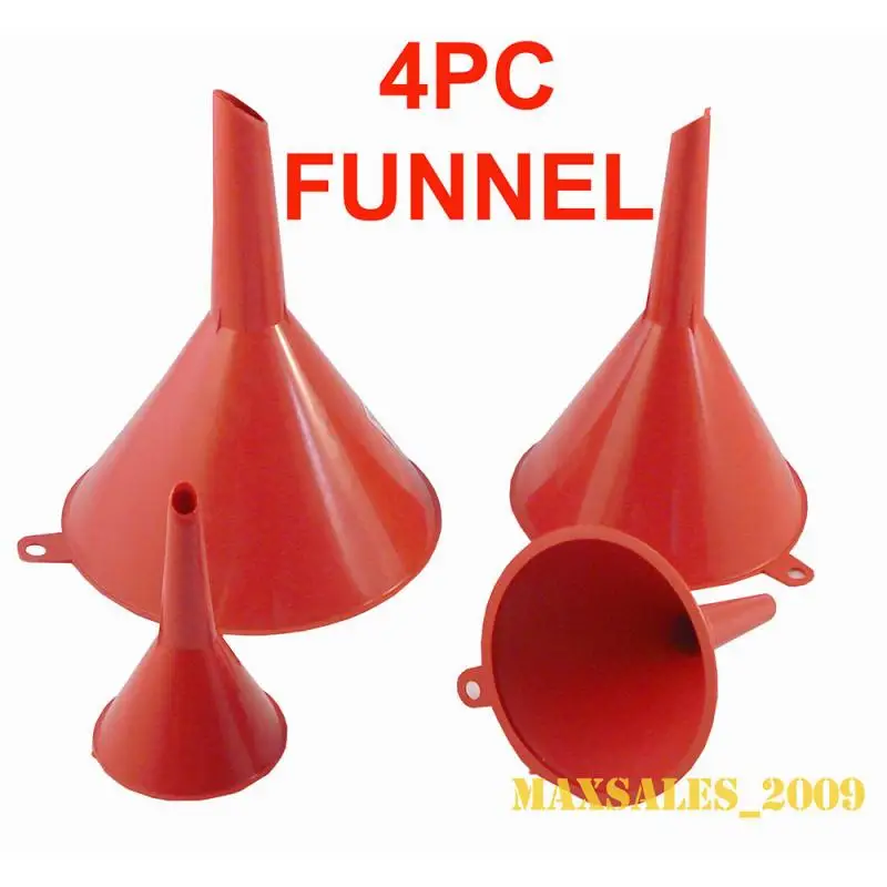 These plastic funnels are durable enough for everyday use in the shop or garage. The funnel set includes 2 in, 3 in, 4 in, 5 in. funnels to accommodate numerous applications. The funnels are brightly colored so they’re easy to find among your other tools.