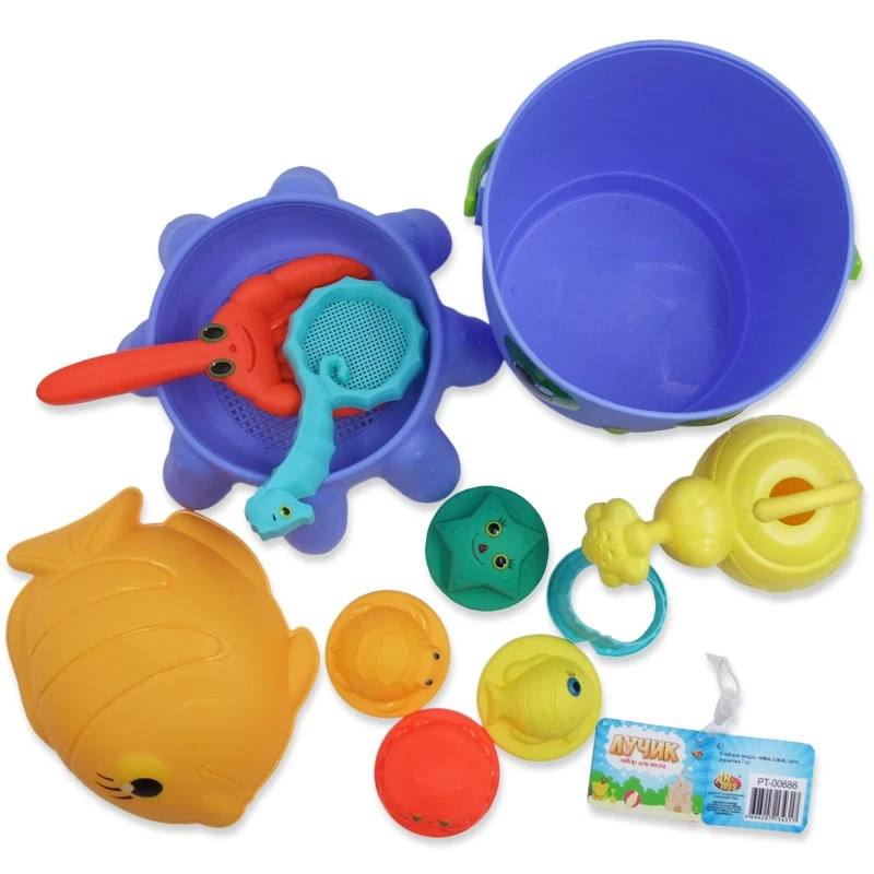 Комплектация (11 предметов): ведерко, 2 лопатки, ситечко, лейка, 5 маленьких формочек, большая формочка.