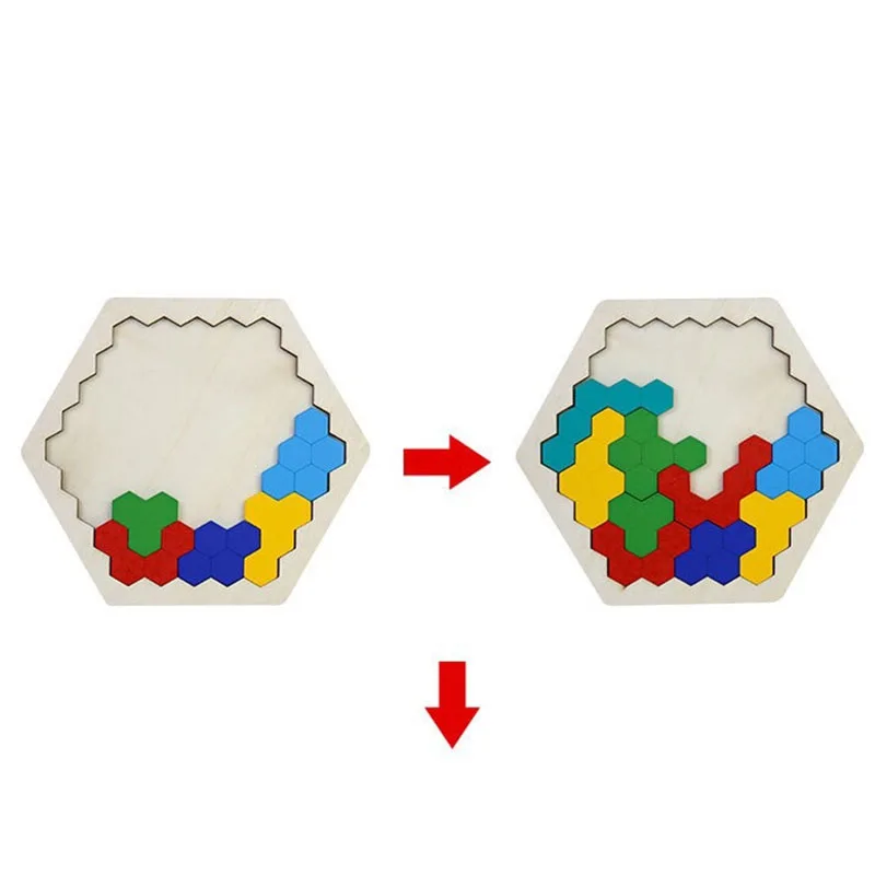 Эта Геометрическая шестиугольная головоломка содержит 14 геометрических блоков и 1 деревянное основание. Он предлагает вам различные решения для завершения головоломки. Вы можете стараться изо всех сил, чтобы найти больше решений и сделать это с вашими детьми, чтобы развить их когнитивные способности, логическое мышление и моторику.