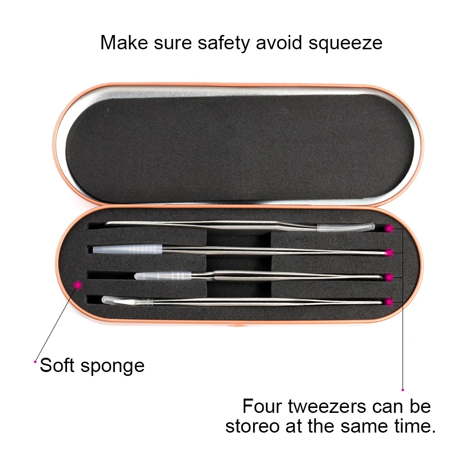 This tweezers box can store 4pcs tweezers one time, special slot design, can keeps the tweezers in order and no worry of shaking. Except for tweezers, it also can store eyelash brushes, scissors, eyebrow razors and so on.