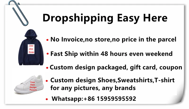 О дропшиппинг: мы поддерживаем хорошее качество, дешевую цену и быструю доставку в течение 48 часов. Нет счета-фактуры, нет информации о магазине, нет цены в посылке. Также сделайте индивидуальный дизайн упакованы, подарочные карты, купон для вас. Выберите нас, чтобы сделать дропшиппинг более легким. Свяжитесь с нами в whatsapp + 86 15959595592 для получения более подробной информации.