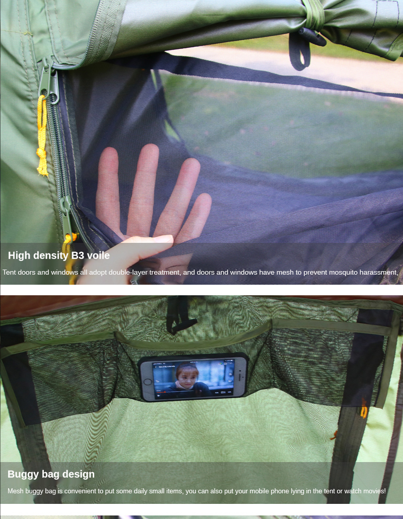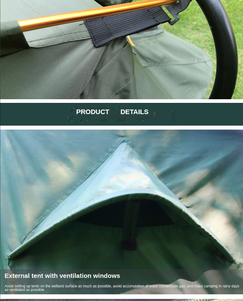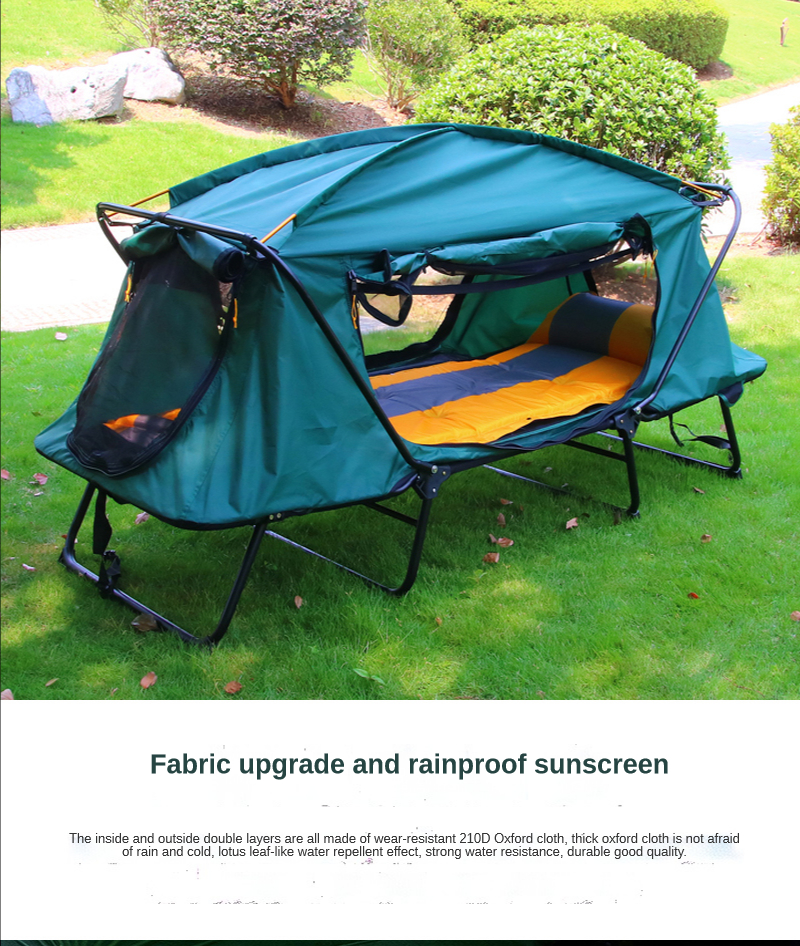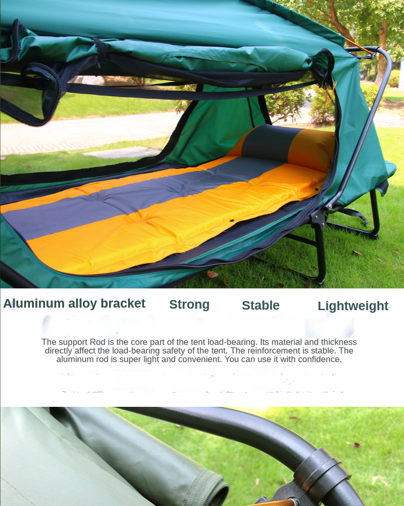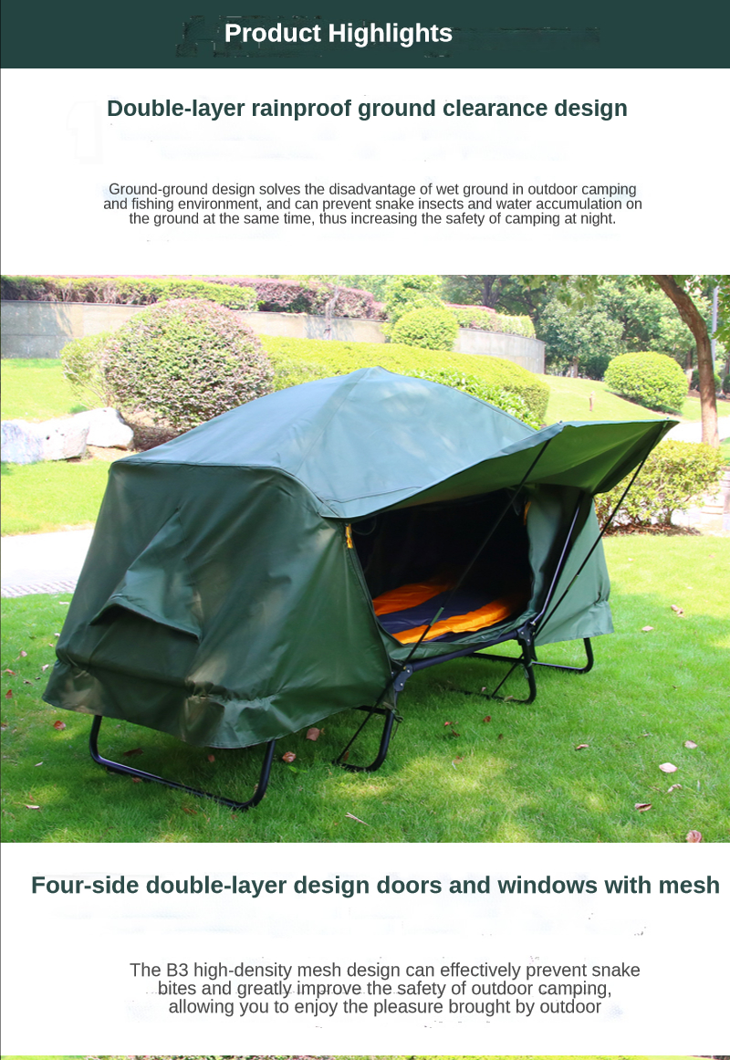 Информация о продукте Размер изделия: 210*80*120 см Ткань изделия: 210D ткань Оксфорд PU2000-3000 Базовая ткань: 210D ткань Оксфорд PU2000-3000 Поддерживающий Материал: 25 мм стальная труба + 2 алюминиевых стержня Конфигурация продукта: палатка + гвоздь для пола + ветряная веревка + столб Холла Основные характеристики продукта: двухслойная защита от дождевых штормов, дизайн вне Земли, решает недостатки влажной земли в открытом кемпинге и рыбацкой среде, и в то же время может предотвратить змей, насекомых и мышей, И предотвращает попадание воды на землю, что повышает безопасность ночного кемпинга. Используйте 210D ткань Оксфорд PU2000-3000 высококачественной водонепроницаемой ткани, которая является чрезвычайно водонепроницаемой.