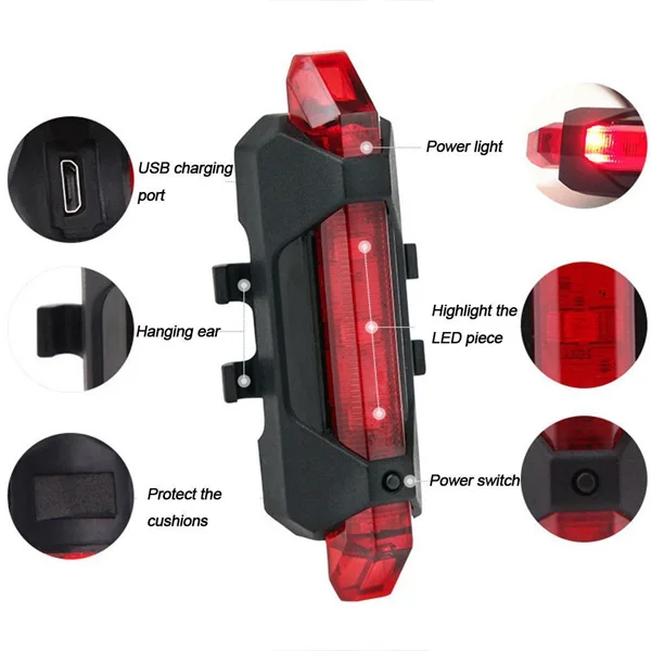 -Он состоит из светильникЦвет: красныйЧто вы можете разместить как на задней части велосипеда, так и на руле. Он имеет4 различных режима освещения: Полные константы, погоня, вспышка, медленная вспышка. Функция: удерживайте кнопку 1 секунды, чтобы включить или выключить светильник, нажмите