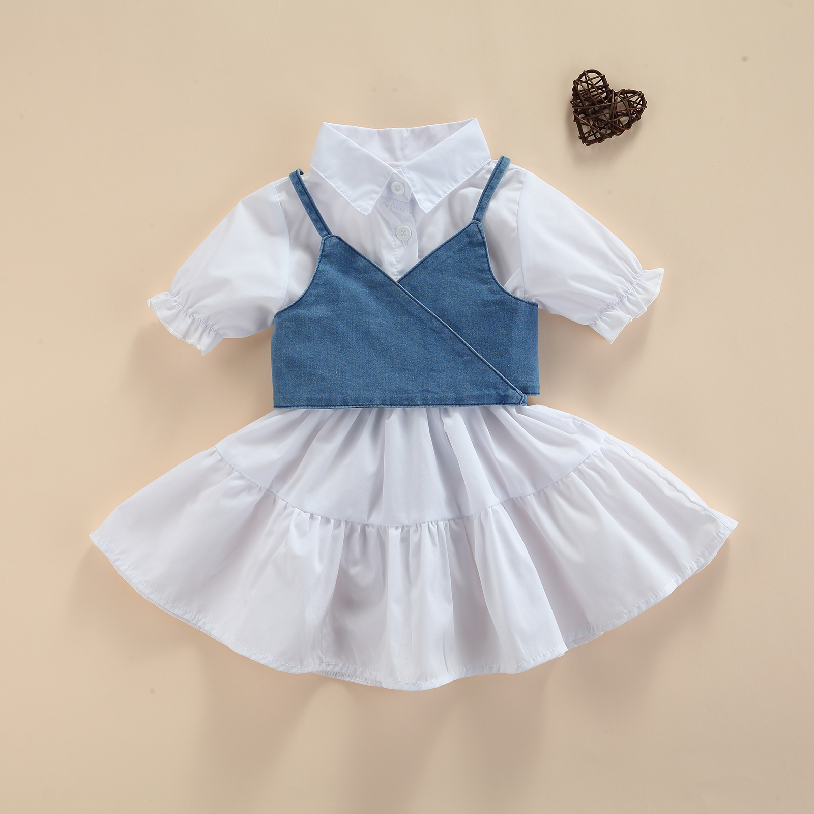 Это детское платье с короткими рукавами-летний наряд с джинсовым жилетом, с простым фасоном однобортного дизайна.