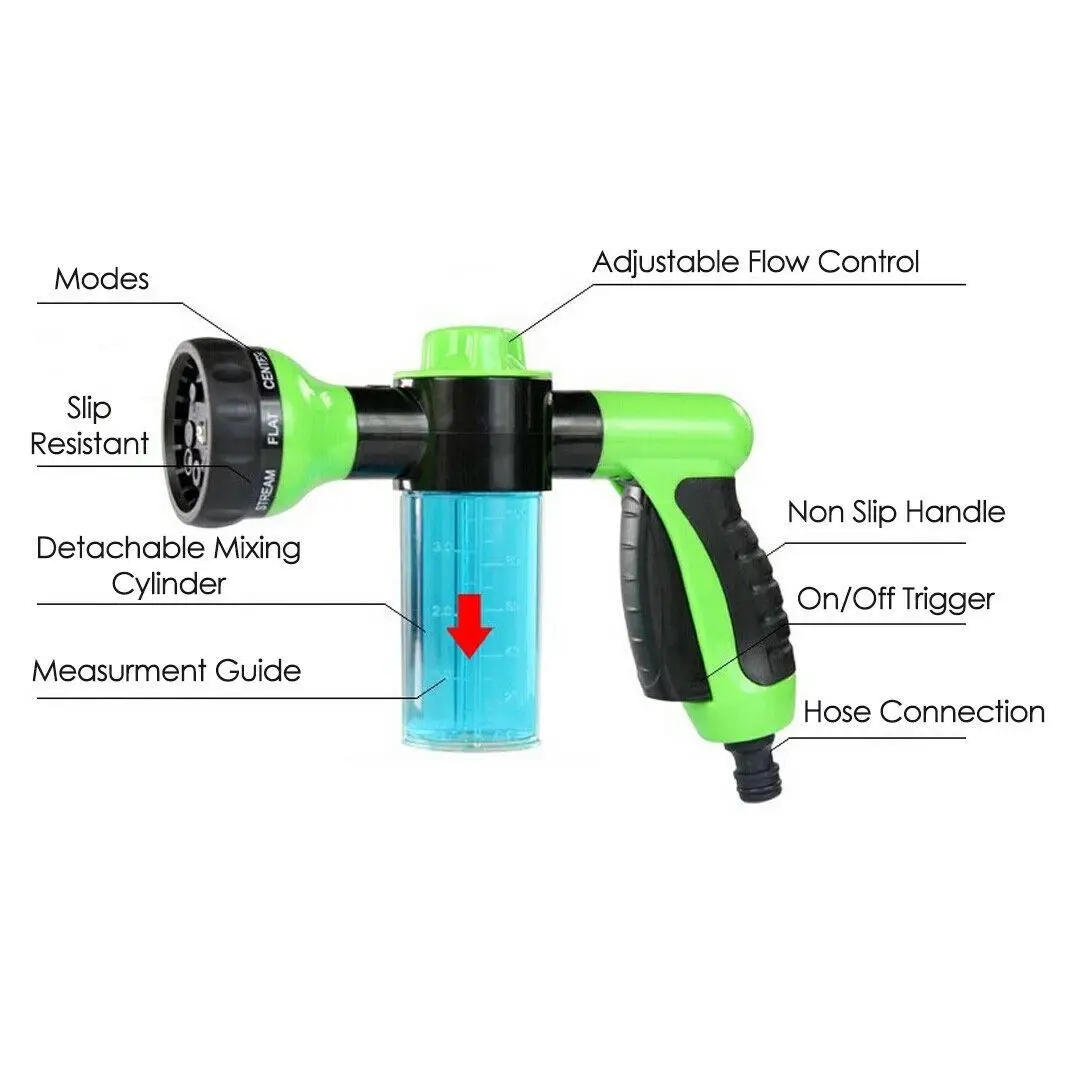 Упростите мытье автомобиля с помощью этого шланга, это многорежимная Распылительная насадка с резервуаром для мыла объемом 100 мл. Наполните резервуар жидким мылом и используйте ручку для регулировки лука много смешиваний с распылителем, Намылить ваш автомобиль без использования ведра и губки. Вы также можете наполнить резервуар удобрением и использовать его для легкого питания ваших растений.
