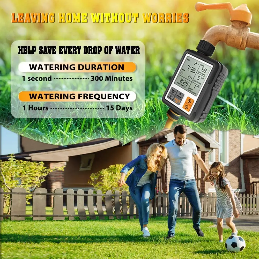 -Настройка времени: вы можете установить время полива и текущее время. -Время полива: минимальное время одиночного полива может быть установлено на 1 секунду, а самое длинное время одиночного полива-на 300 минут. -Цикл полива: 1-23 ч, 1 день и 2 дня... самый длинный цикл-15 дней. -ЖК-экран: вы можете увидеть дисплей обратного отсчета следующего полива и выключить питание. -Задержка в дождливые дни: если вы хотите задержать в дождливые дни, просто нажмите кнопку для воды. -Низкое энергопотребление: две батарейки AA используется для более 1 года. -Защита от дождя: может устанавливаться на открытом воздухе вертикально. -Функция временного полива: это не повлияет на программу набора.