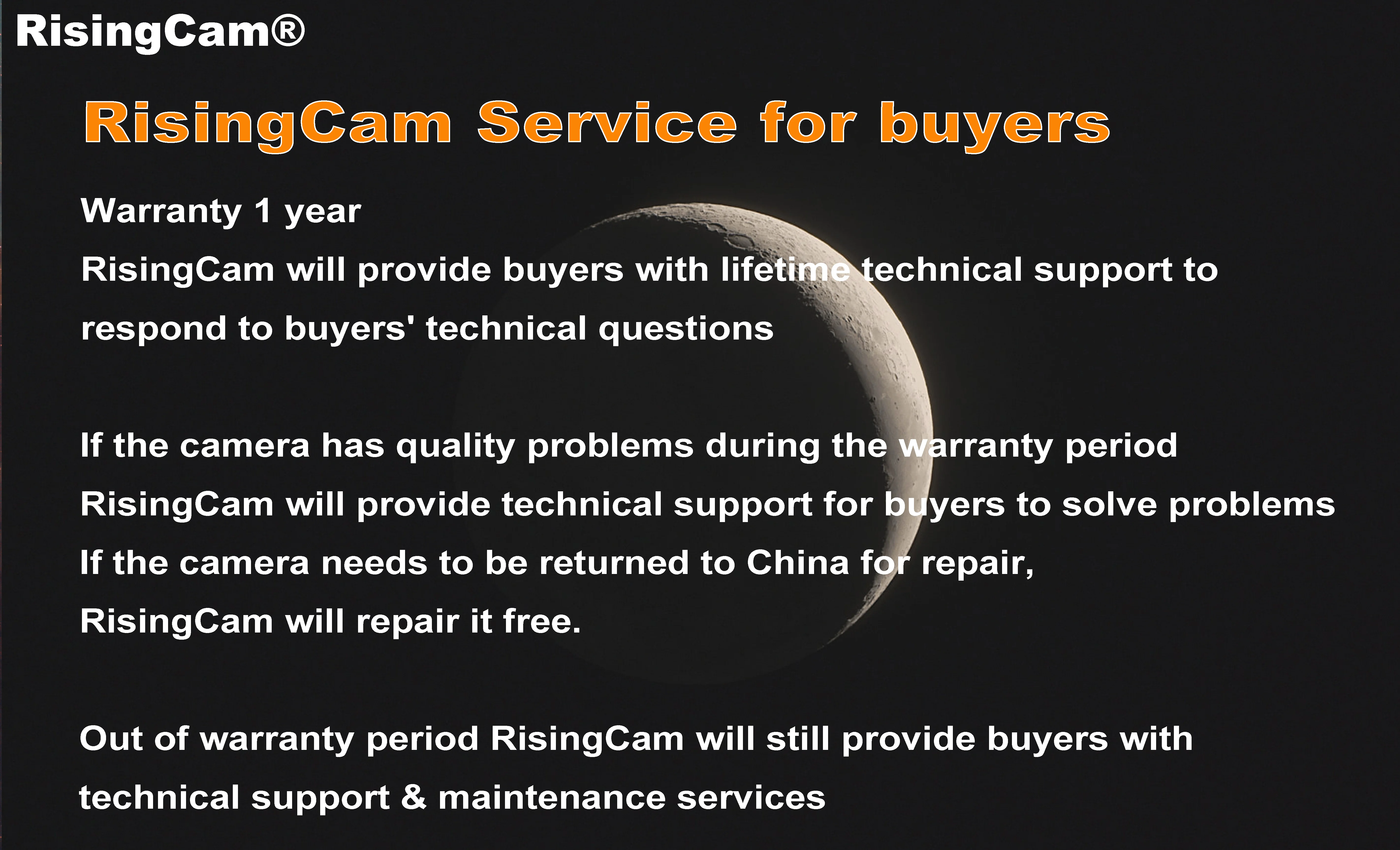 В течение гарантийного срока компания RisingCam будет по-прежнему предоставлять покупателям услуги технической поддержки и обслуживания