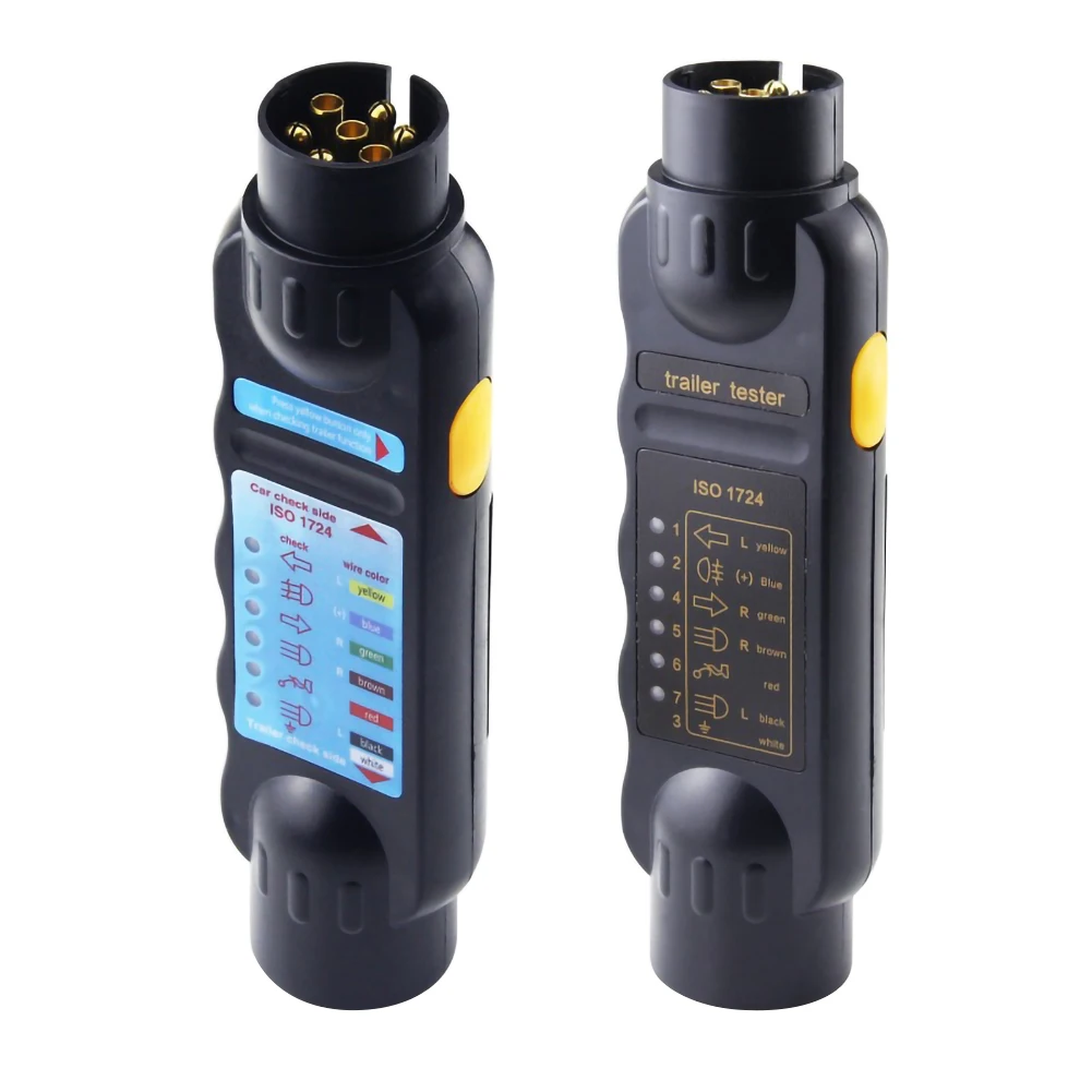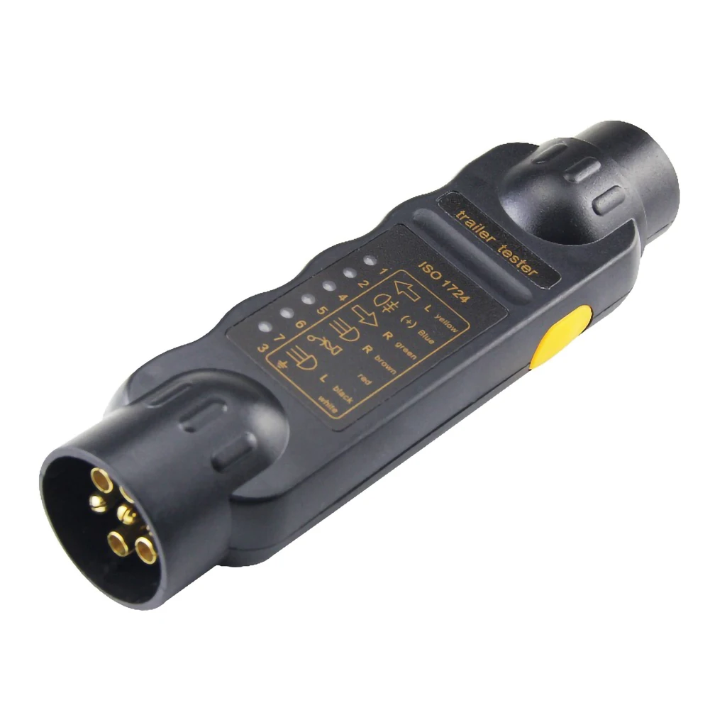 3. Просто вставьте тестер в 7-контактный разъем или 7-контактный штекер прицепа или каравана и нажмите на желтую кнопку на стороне тестера