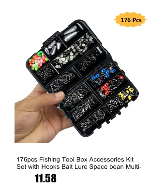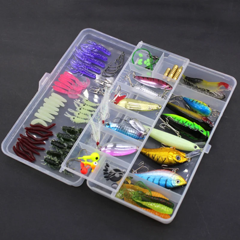 Посылка входит:100 шт. рыболовные приманки (6 шт., жесткая приманка, 6 шт. металлических блёсток, 51 шт. Мягкая приманка, 37 шт. аксессуары для приманки)