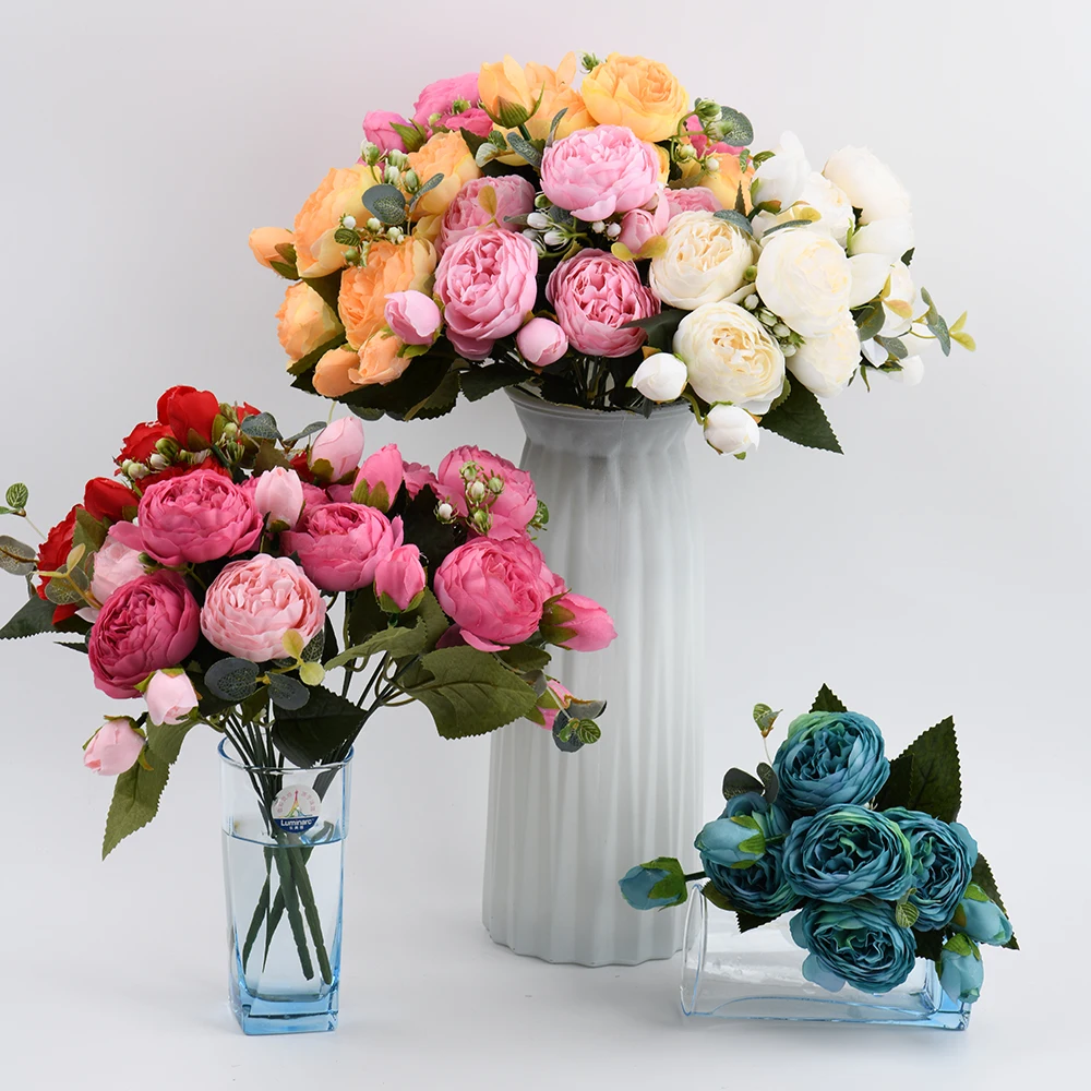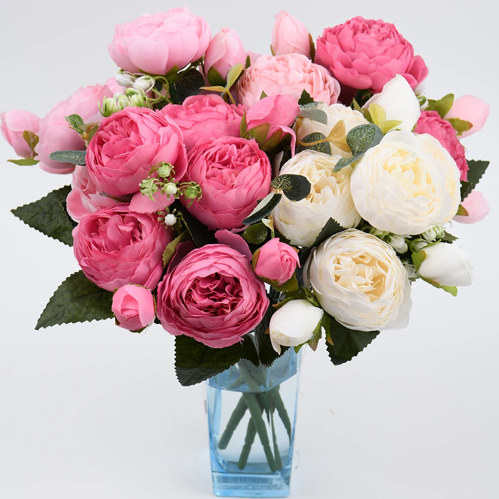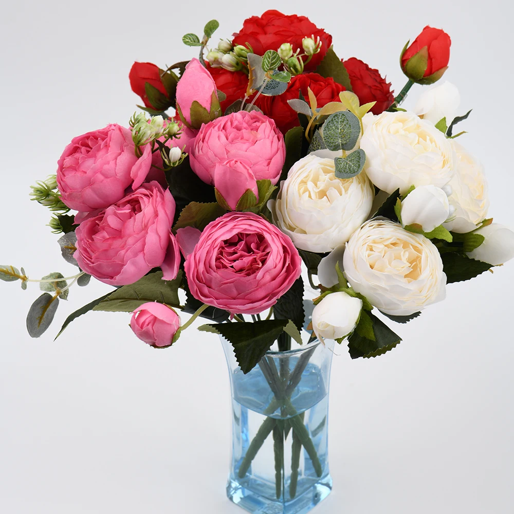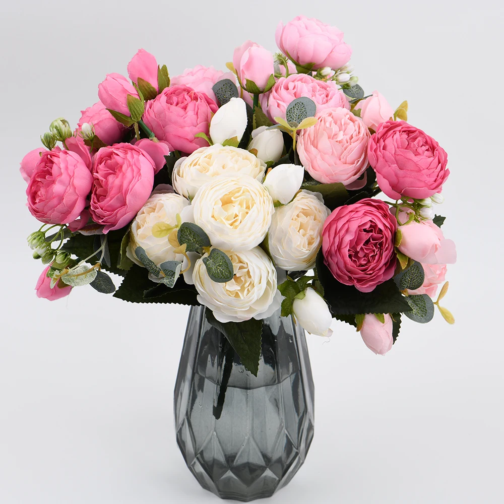 Розовые шелковые искусственные пионы, букет высотой 30 см из 5 больших цветков и 4 закрытых бутонов, недорогие искусственные цветы для украшения интерьера дома и на свадьбе