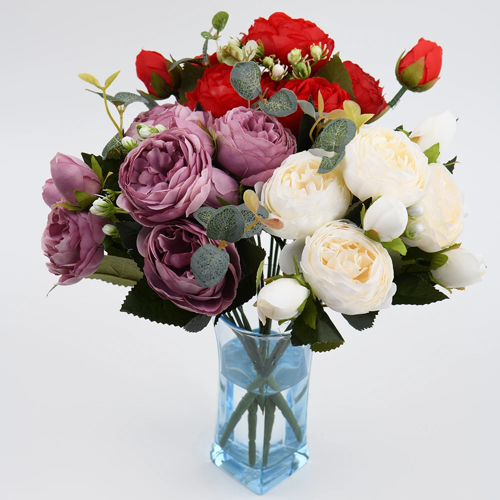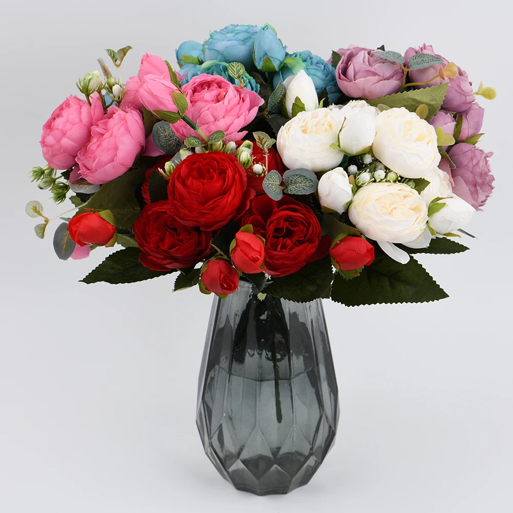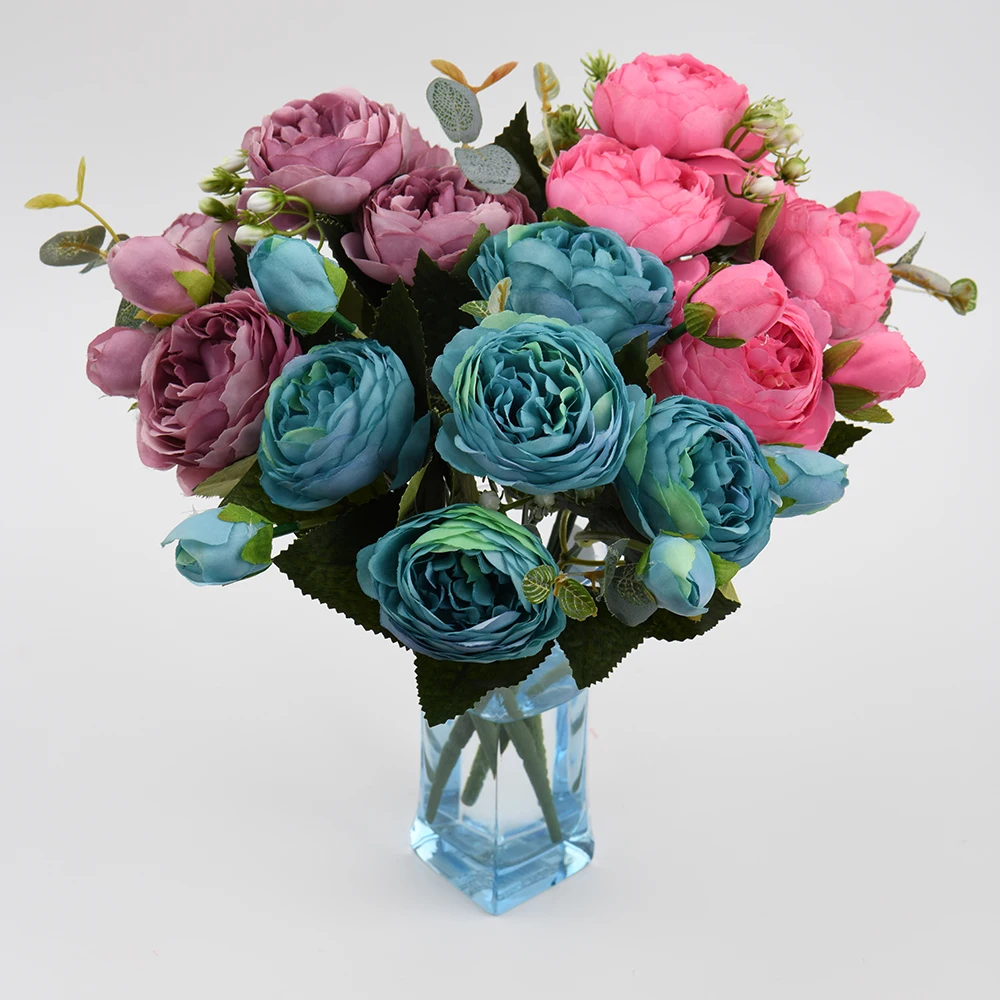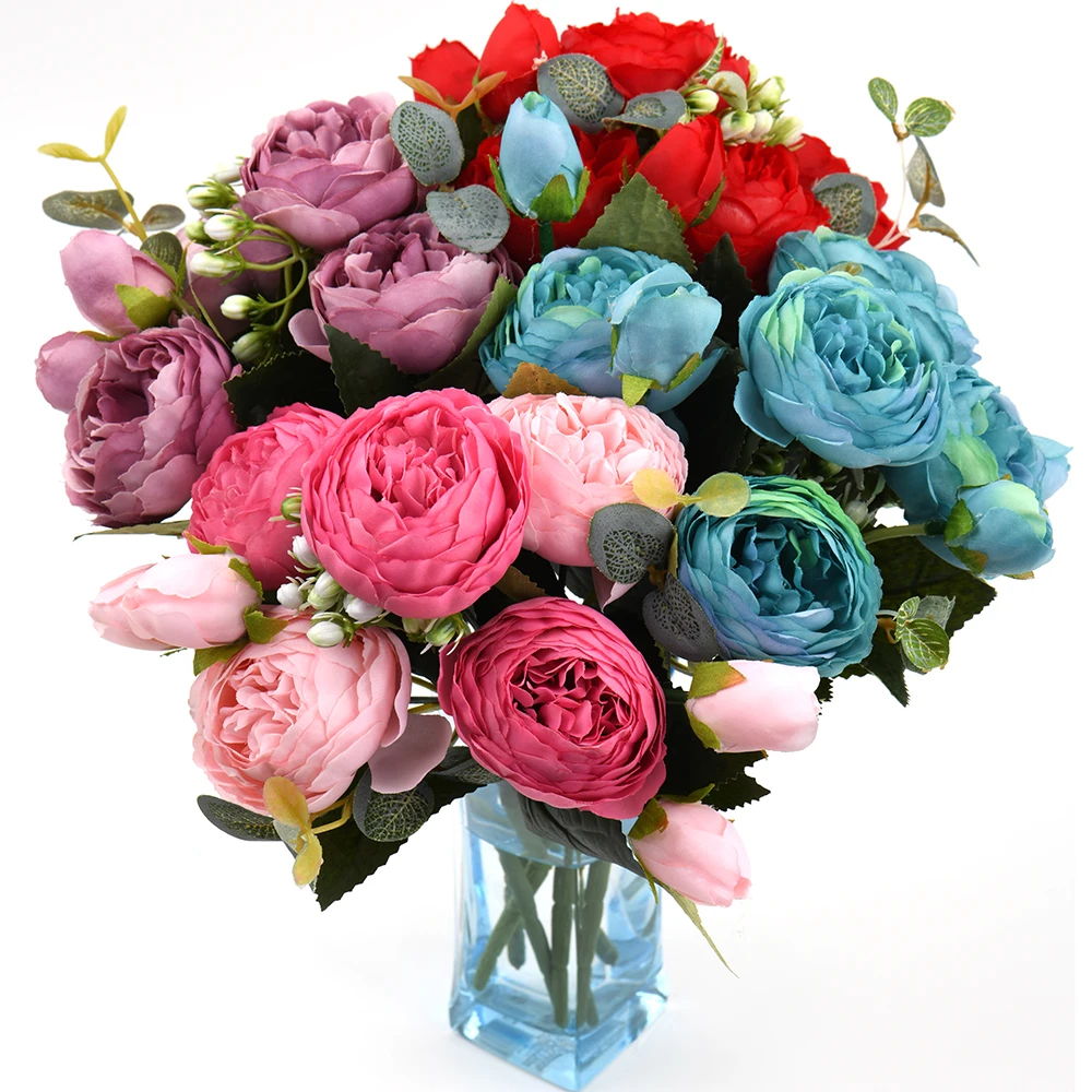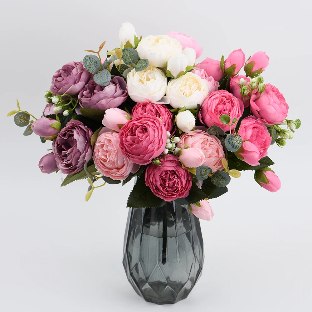 Розовые шелковые искусственные пионы, букет высотой 30 см из 5 больших цветков и 4 закрытых бутонов, недорогие искусственные цветы для украшения интерьера дома и на свадьбе