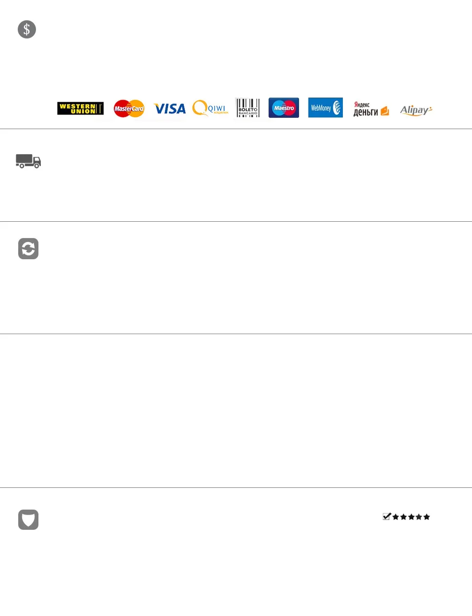 В настоящее время клиент может оплатить с помощью PayPal, Boleto, Visa, MasterCard, QlWl, Western Union, дебетовой карты Maestro, WebMoney