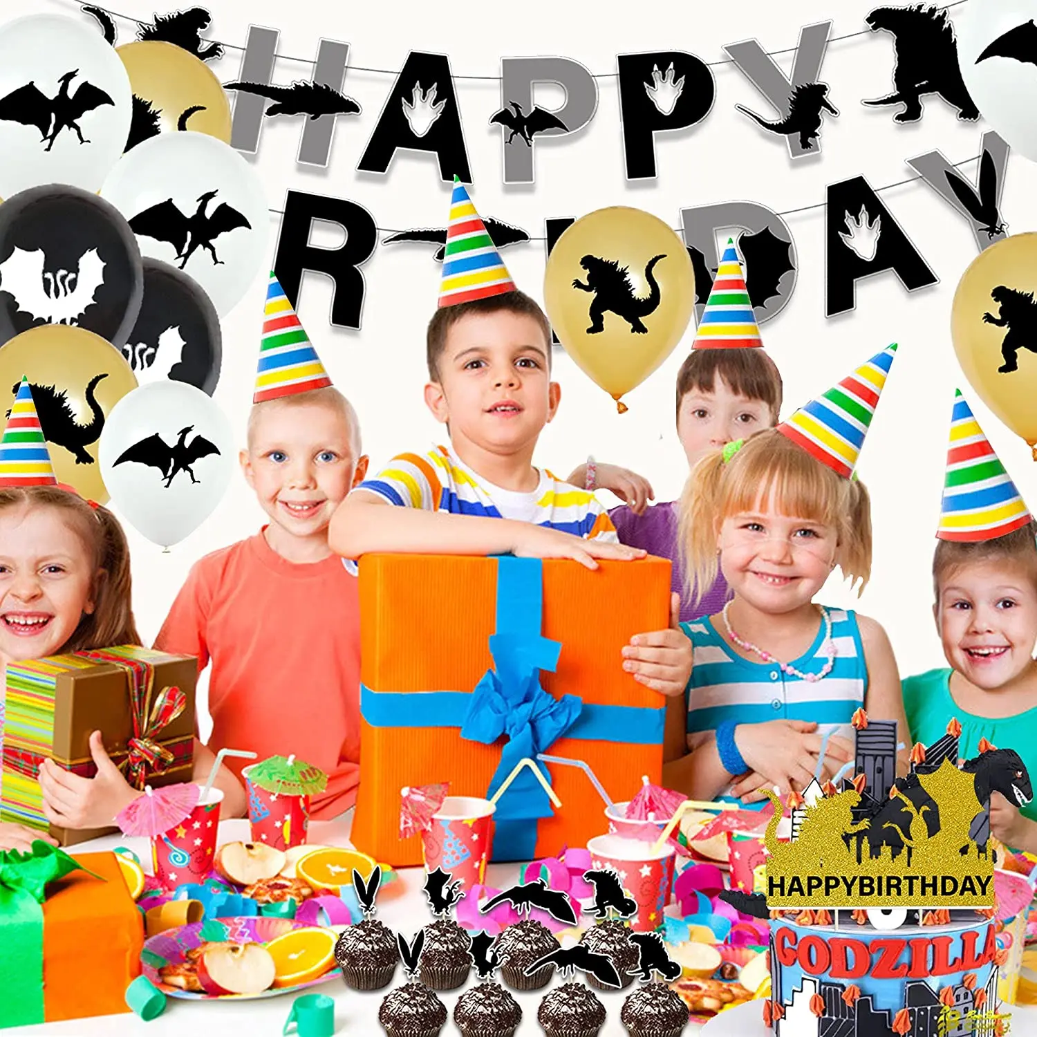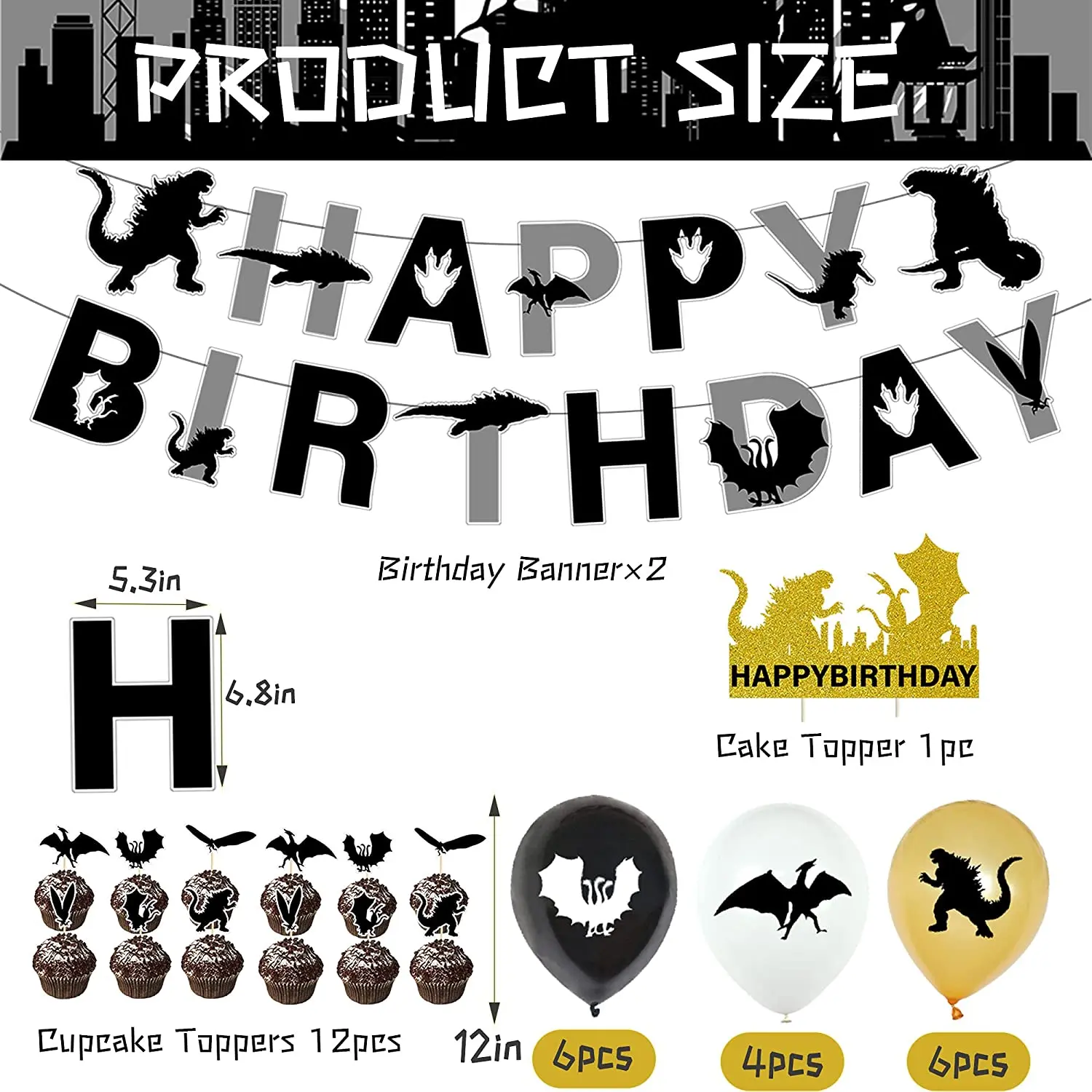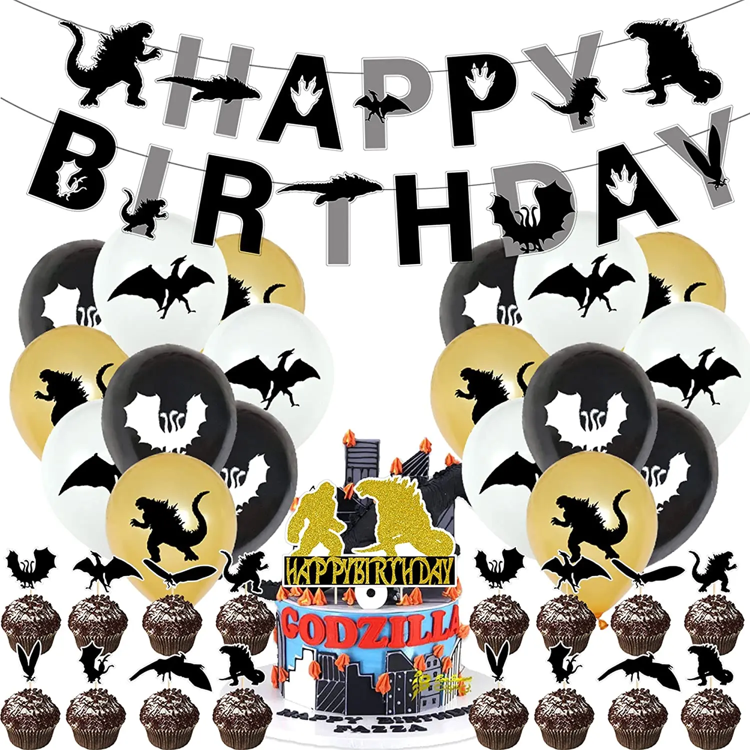 1 Годзилла с днем рождения баннер, 18 латексных шаров (3 различных стиля, 6 штук для каждого стиля), 1 день рождения торт украшения и 16 флажки для торта.