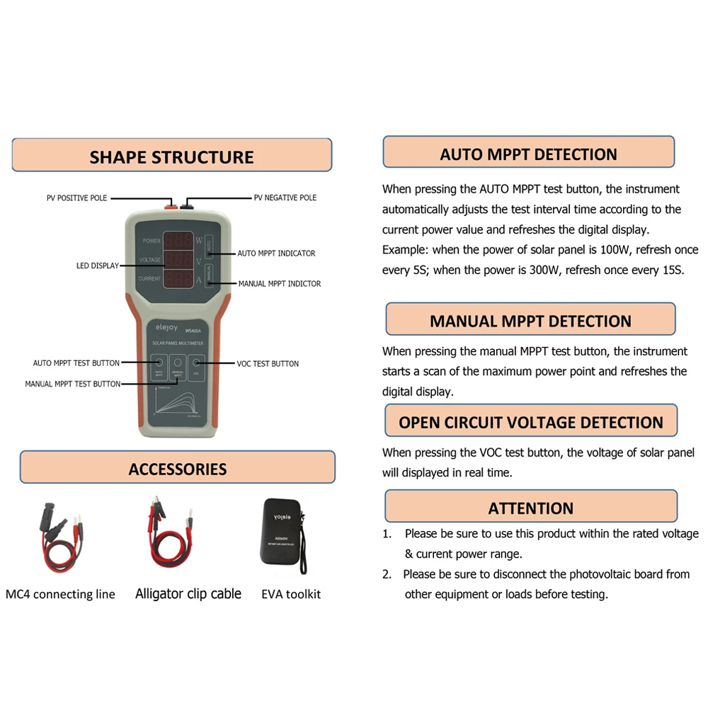 Этот мультиметр для солнечной панели может протестировать максимальную точку мощности и напряжение открытой цепи фотоэлектрической панели, а также использовать фотоэлектрическую панель для поддержки мощности. С портативным дизайном, легко держать. Приходите и попробуйте, это не подведет вас.