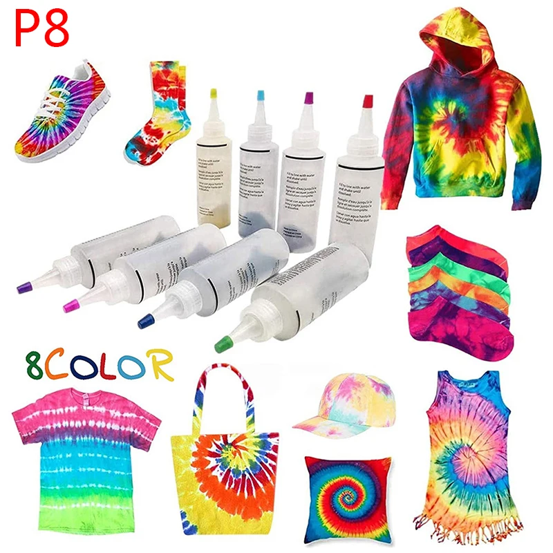 8 цветов: 8 шт. красителей (разные цвета s), 40 шт. белых резиновых лент, 8 шт. одноразовых перчаток, 1 шт. Руководство пользователя