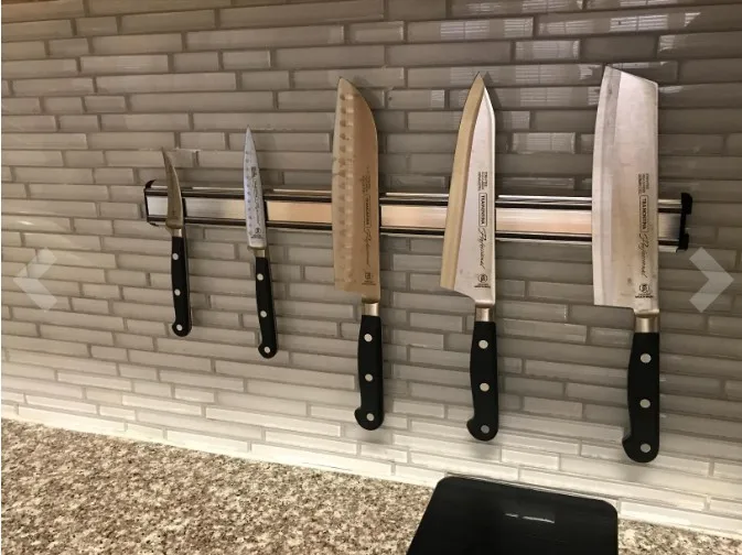 Наша магнитная лента для ножей из нержавеющей стали надежно удерживает самые большие, самые тяжелые ножи до самых маленьких и самых маленьких-ножи шеф-повара, ножи мясника, клевера, ножи для хлеба и любые другие кухонные ножи, которые у вас могут быть.